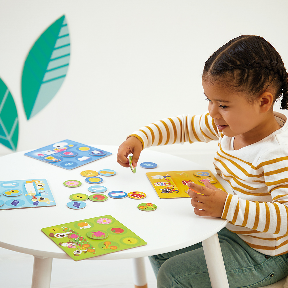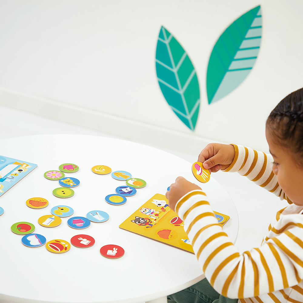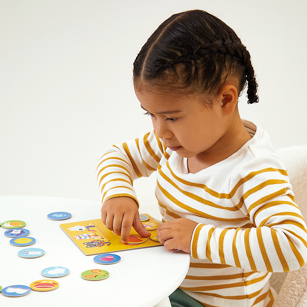 Kooperativní hra: dospělý nebo jiný hráč popisuje předmět a dítě ho hledá na své desce – ideální pro rozvoj řečových i poslechových dovedností.