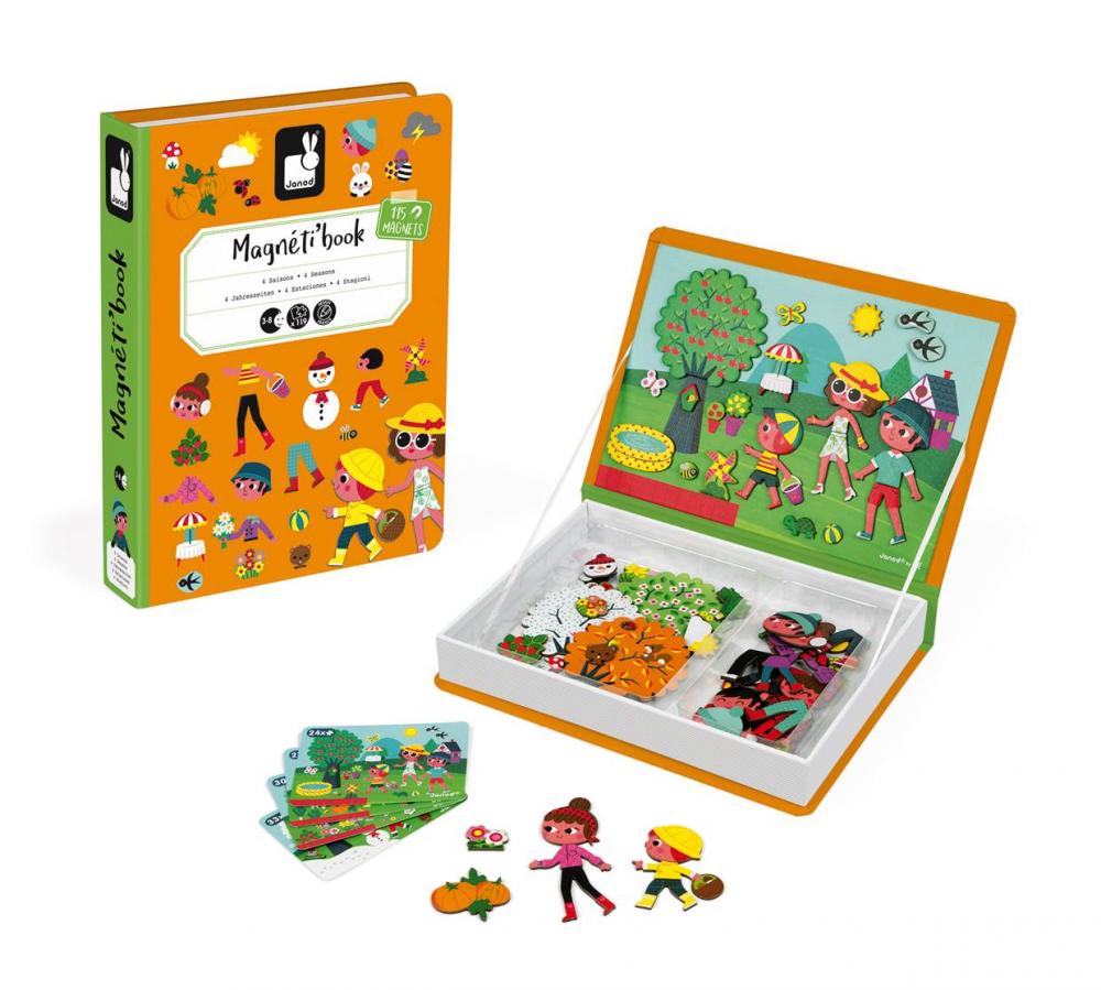 Magnetická hračka Roční období je vhodná pro děti od 3 let. Děti podle vzoru skládají scenérii daného ročního období s vhodným oblečením a doplňky. Magnetická dětská hračka obsahuje 4 karty se vzory a 115 magnetických dílů. Praktický obal v podobě knihy zajistí, že hračka může být pohodlně přenášena, děti ji tak využijí nejen doma, ale i na dlouhých cestách. Vyrobená je z vysoce kvalitních materiálů a neškodných barev.
