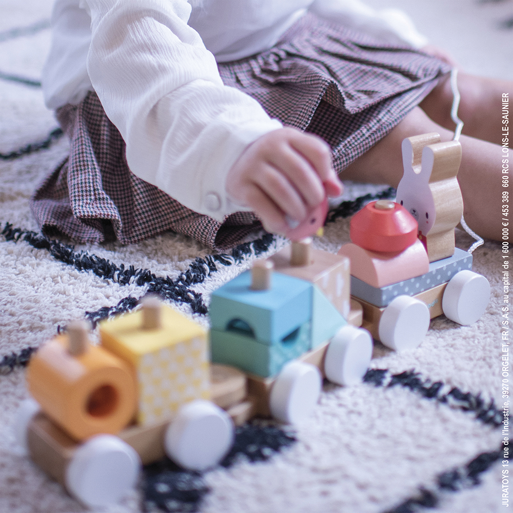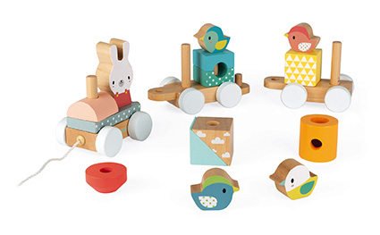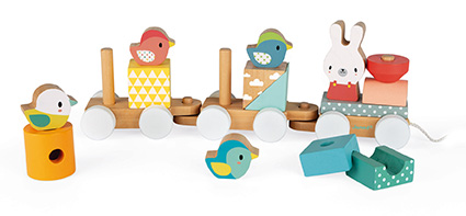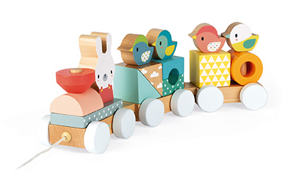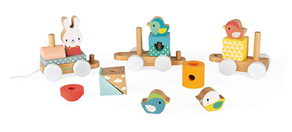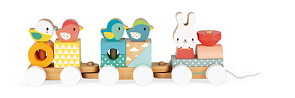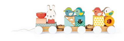 Na tomto vláčku je větší zajíček a kostky – vagóny, na každé kostce sedí roztomilý barevný ptáček. Děti si mohou kostky na vagónech vyměnit, složit podle sebe, vyměnit ptáčky, složit menší nebo větší vláček… Dřevěná hračka děti zaujme svými krásnými pastelovými barvami a roztomilými zvířátky. Při hře s ní si děti rozvíjejí a zdokonalují jemnou motoriku.