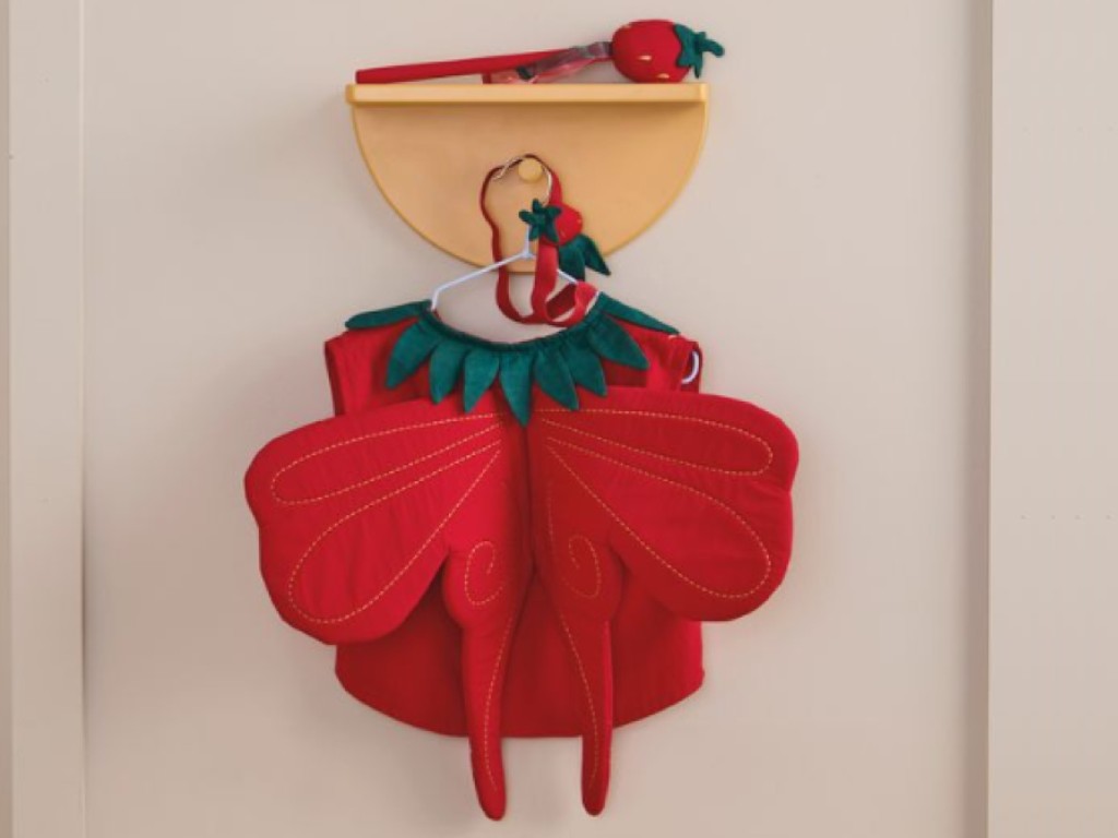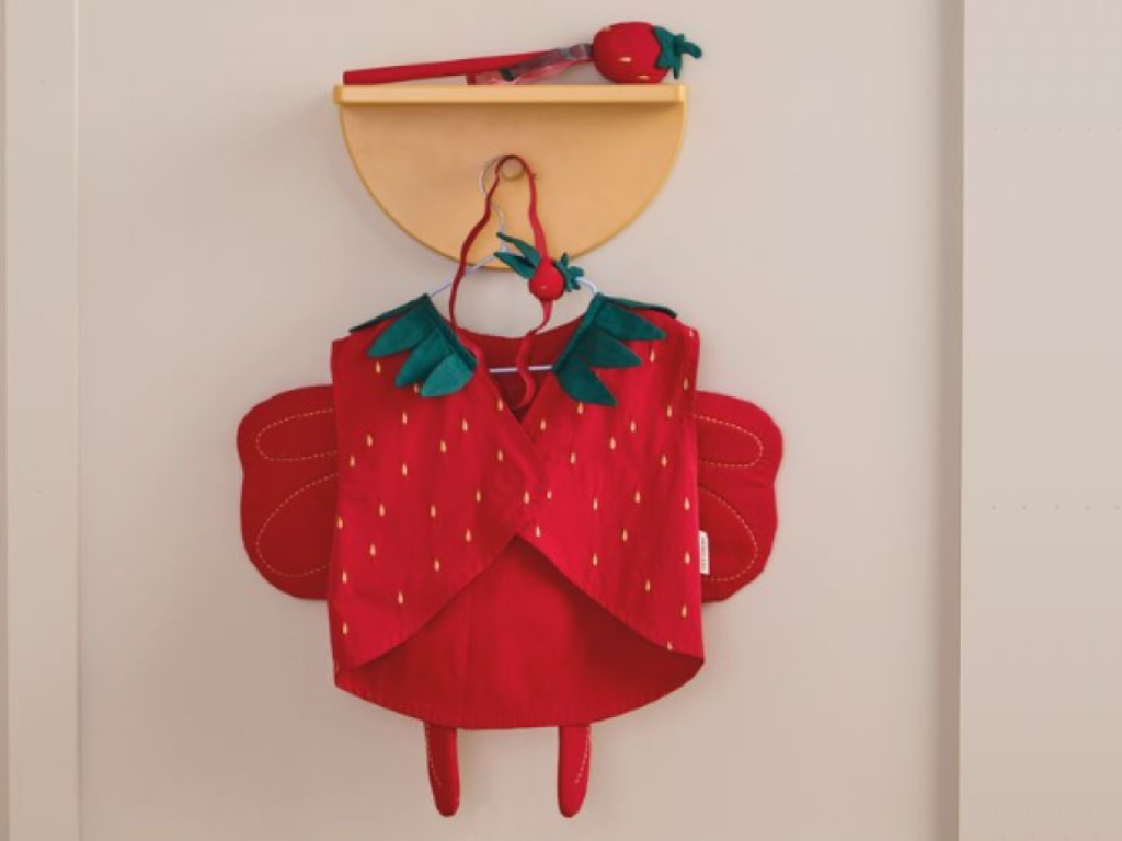 Roztomilý jahodový kostým přinese do dětské hry kouzlo léta, fantazie i osvěžující dobrodružství. Červená vesta má zaoblenou přední část, zelený límec s listy a praktické zapínání na suchý zip, díky kterému se snadno obléká i svléká. Záda kostýmu zdobí malá vycpaná křídla, která dodávají celé sadě pohádkový nádech. Kostým je nejen stylovým převlekem, ale i skvělým pomocníkem pro rozvoj fantazie a tvořivé hry. Nechybí ani čelenka s ozdobnou jahodou a ladící hůlka, se kterou mohou děti proměňovat svůj svět, třeba v kouzelnou jahodovou zahradu.