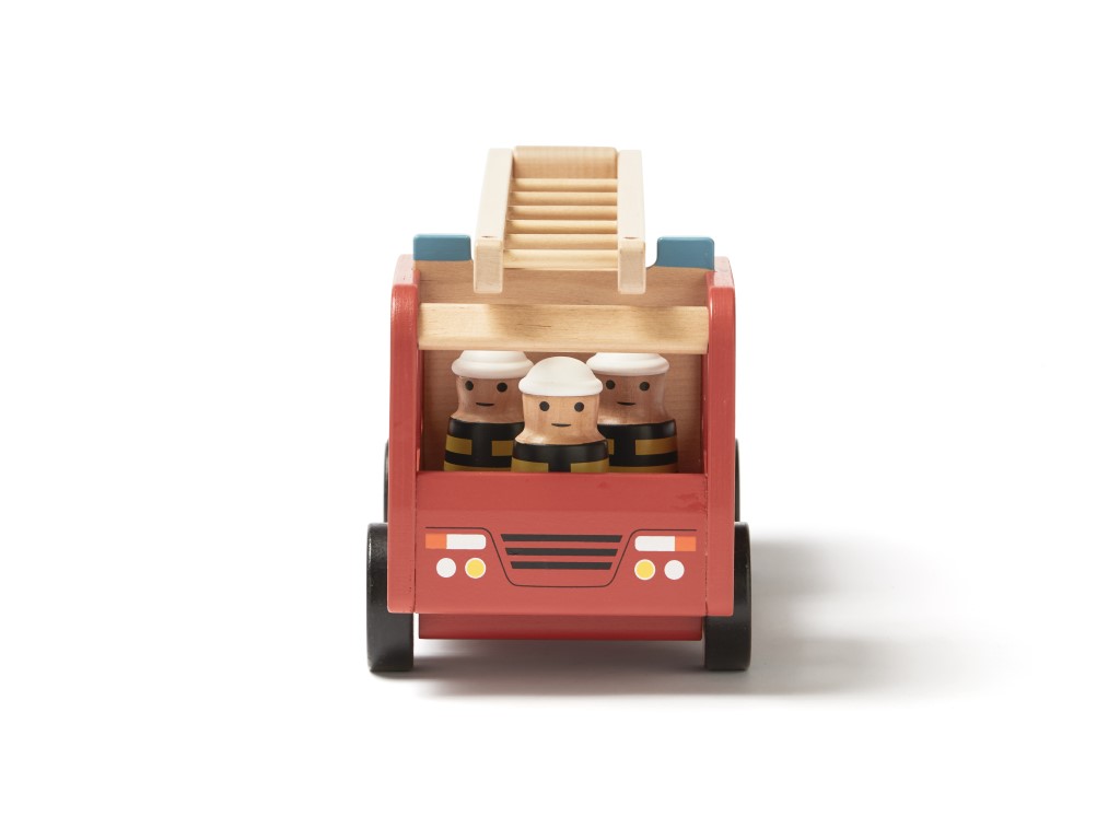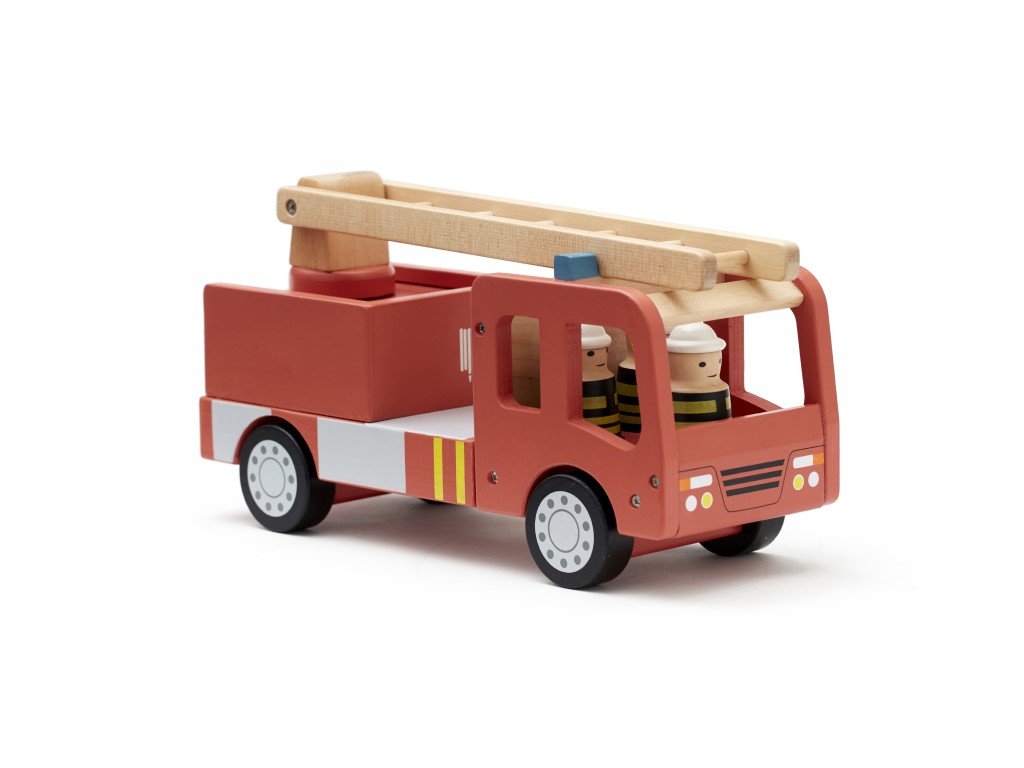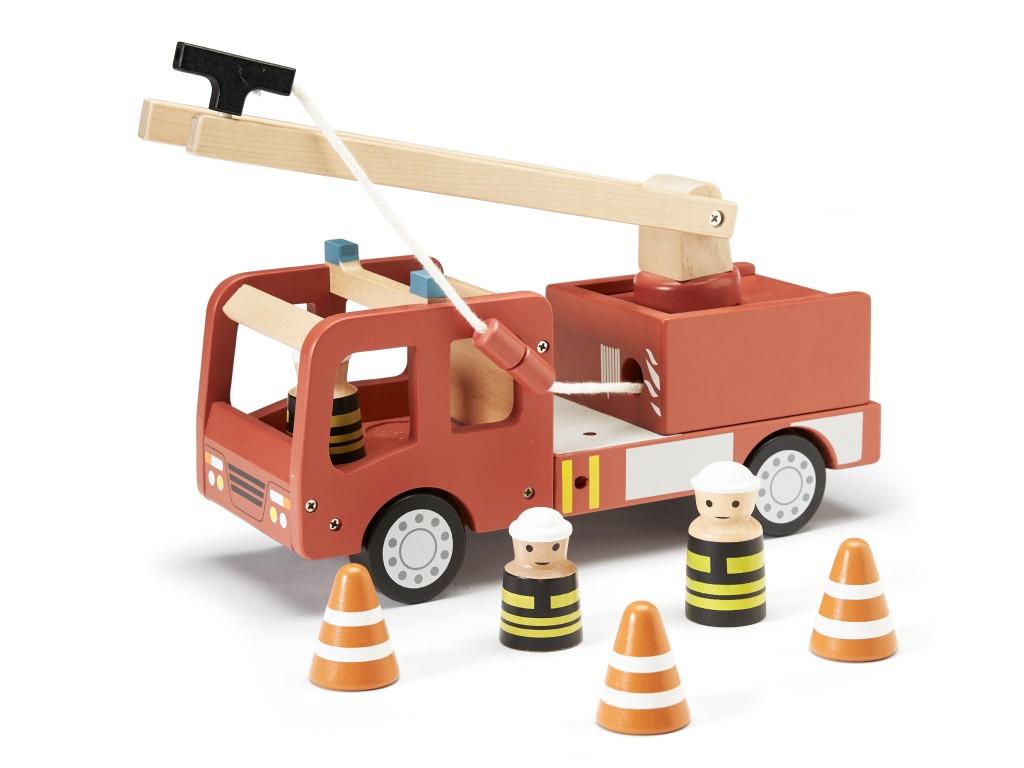 Velké hasičské auto s bohatým příslušenstvím a s odvážnými hasiči uhasí každý požár. Žebřík lze otáčet horizontálně i vertikálně. Hasičskou hadici lze připojit k vnějšímu okraji žebříku. Pomocí tří kuželů přehraďte silnici, aby kolem neprojížděla auta a nerušila hasiče v jejich důležité práci. Při jízdě kolem lze kužely uložit uvnitř vozu. Hasičské auto z certifikovaného dřeva FSC.
