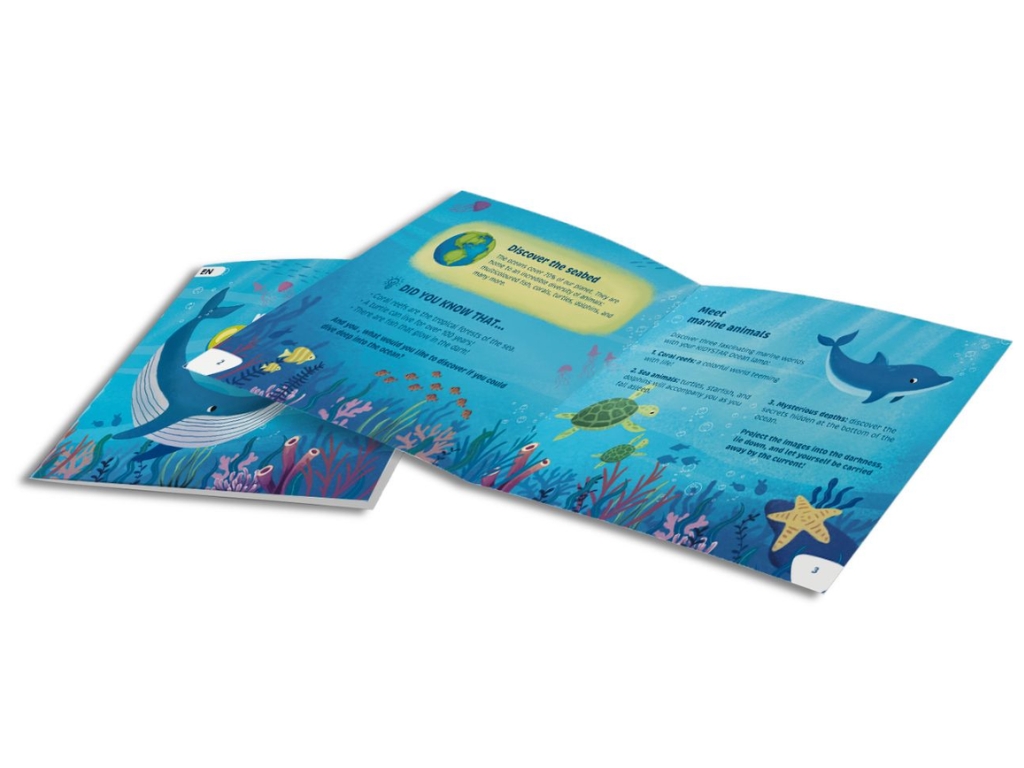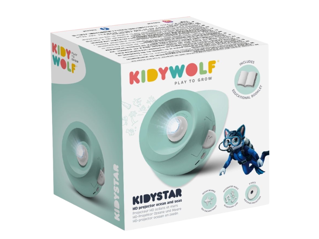 Kouzelná projekce oceánuPodněcuje dětskou fantaziiKompaktní projektor Kidystar promítá na strop dětského pokoje fascinující svět mořských živočichů a vytváří uklidňující atmosféru před spaním. Díky 6 vyměnitelným projekčním diskům nabízí různé motivy, které děti vtáhnou do podmořského dobrodružství.Pomalé otáčení projekce (0,7 ot./min) a jemné LED světlo navozují příjemný vizuální zážitek, ideální pro večerní zklidnění i usínání.Vzdělávací brožuraZvídavost a klid před spanímSoučástí balení je ilustrovaná vzdělávací brožura v angličtině, která rozšiřuje dětské znalosti o oceánu a jeho obyvatelích. Děti tak objevují svět hravou a přirozenou formou.Projektor je navíc vybaven časovačem (15/30/60 min), který pomáhá vytvořit pravidelný večerní režim a podporuje klidné usínání.Technické parametryObsah balení