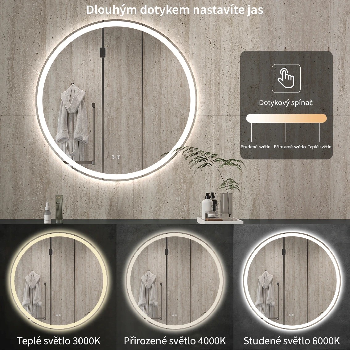 Směr osvětlení:Zadní a přední stranaŠířka:90 cmTvar:KulatýVýška:90 cmBarva světla:VolitelnáNastavitelný jas:NeOsvětlení LED:AnoVypínač:AnoOchrana:CE P44Napětí:200-240 VFrekvence:AC 50/60HzIP ochrana:54Intenzita osvětlení:800-900lmOchrana proti zamlžení:AnoŽivotnost:50000 hodinMateriál rámu:Hliník