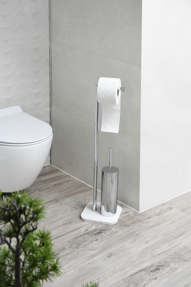 Koupelnový stojan Q-BATH 1566 – minimalistický design, stabilní podstavec z teracového materiálu a chromovaná oceli. Perfektní řešení pro každodenní hygienu.
