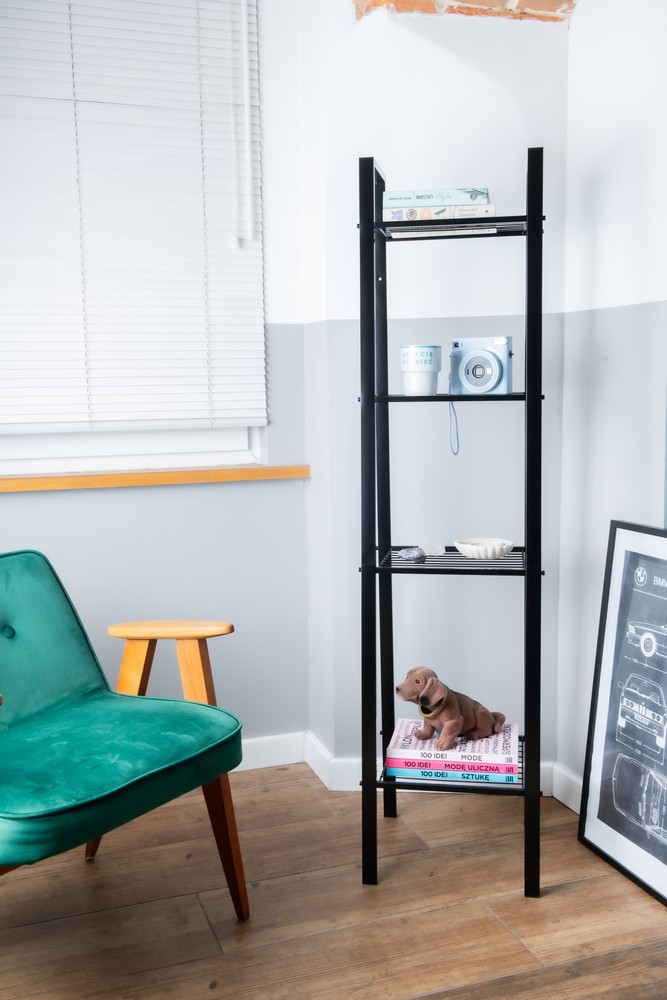Úzká police se čtyřmi policemi ze širokého drátu. Je vyrobena z černě lakované oceli. Bude ideálním řešením pro uložení a vystavení různých předmětů v koupelně, obývacím pokoji nebo na jakémkoli jiném místě ve vaší domácnosti. Tato úzká police nabízí velkou kapacitu a pevnou konstrukci zaručující nejen funkčnost, ale i estetický vzhled. Vyžaduje vlastní montáž.