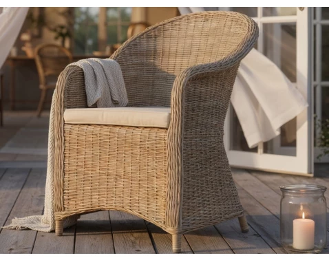Elegantní zaoblené křeslo z umělé imitace ratanu přináší dokonalé spojení stylu, pohodlí a praktičnosti. Díky odolnému materiálu se hodí na zahradu i do bytu.