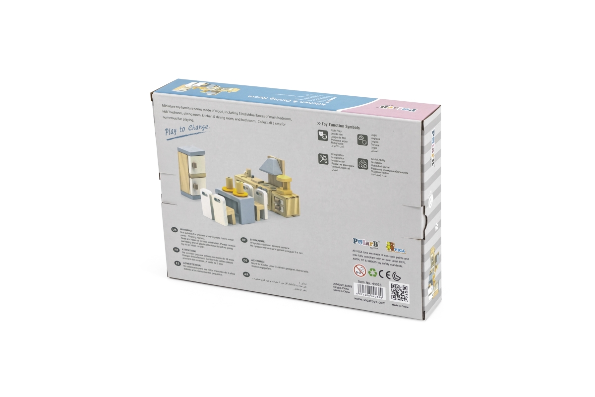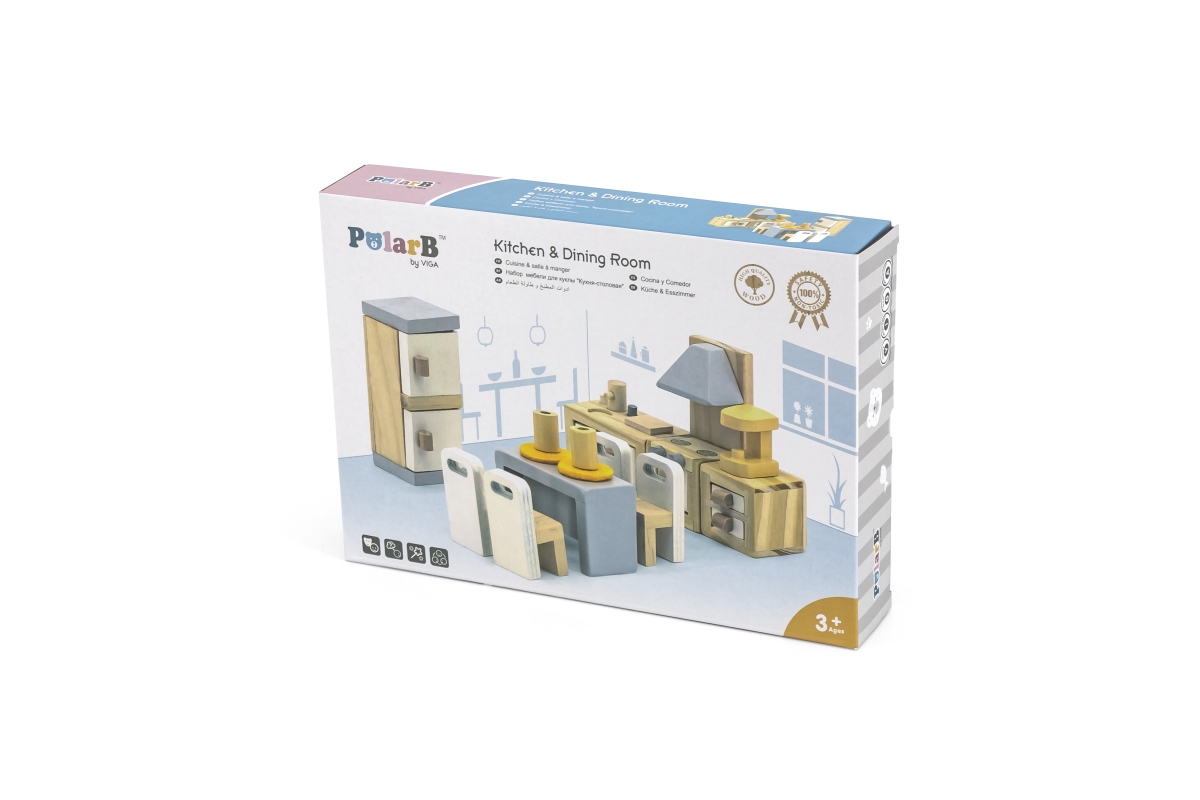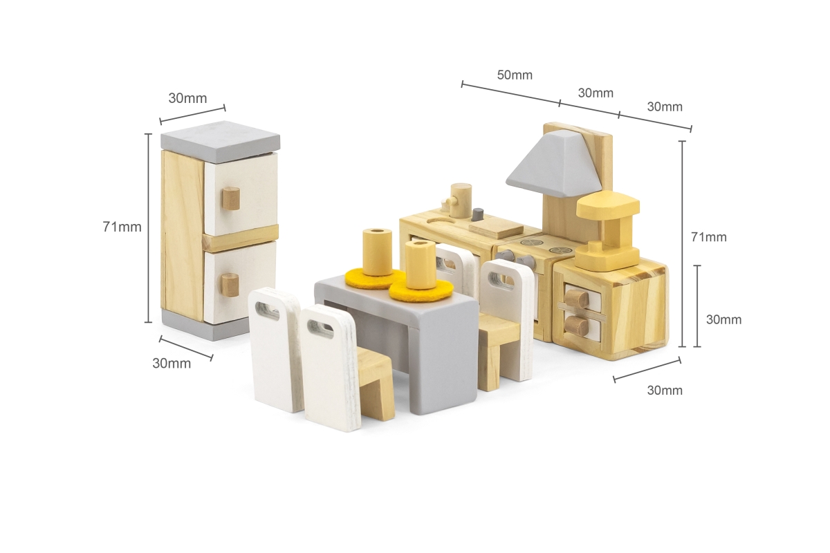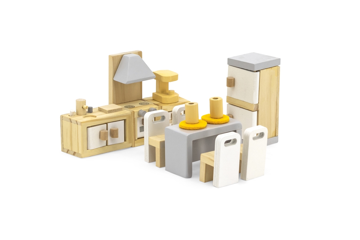 Moderní a stylový nábytek do kuchyně a jídelny, vyrobený ze dřeva, v jemných pastelových barvách, je krásným doplňkem do každého domečku pro panenky a bude ozdobou každé police v dětském pokoji. Díky sadě nábytku si panenky mohou ve svém domečku uvařit nejen oběd, ale i kávu, upéct něco dobrého, umýt nádobí a pohodlně si posedět na židli u velkého dřevěného jídelního stolu.