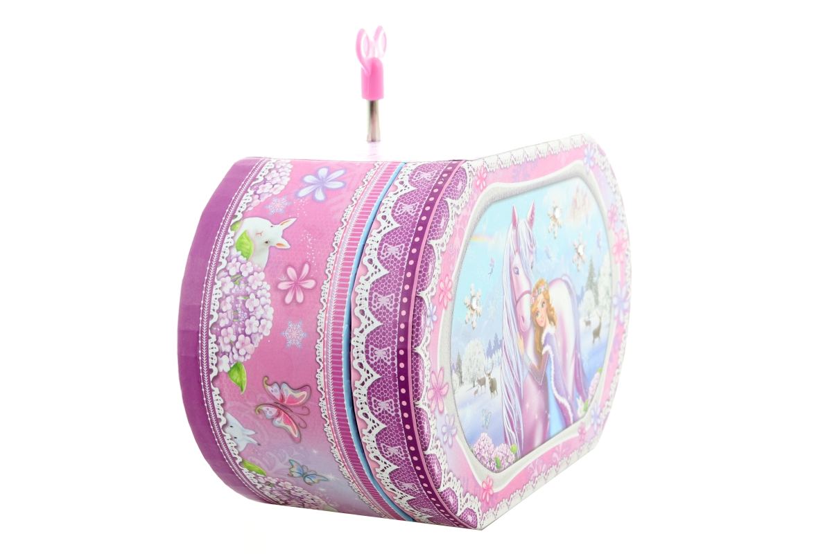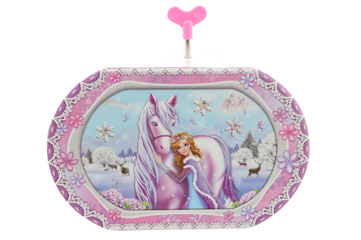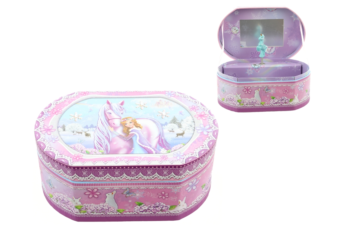 Uvnitř špekovnice je zrcátko a jednorožec, který po natažení klíčku tančí a hraje. Velikost cca 17 x 11 x 8 cm. Baleno v igelitovém sáčku. Výrobek není hračka.