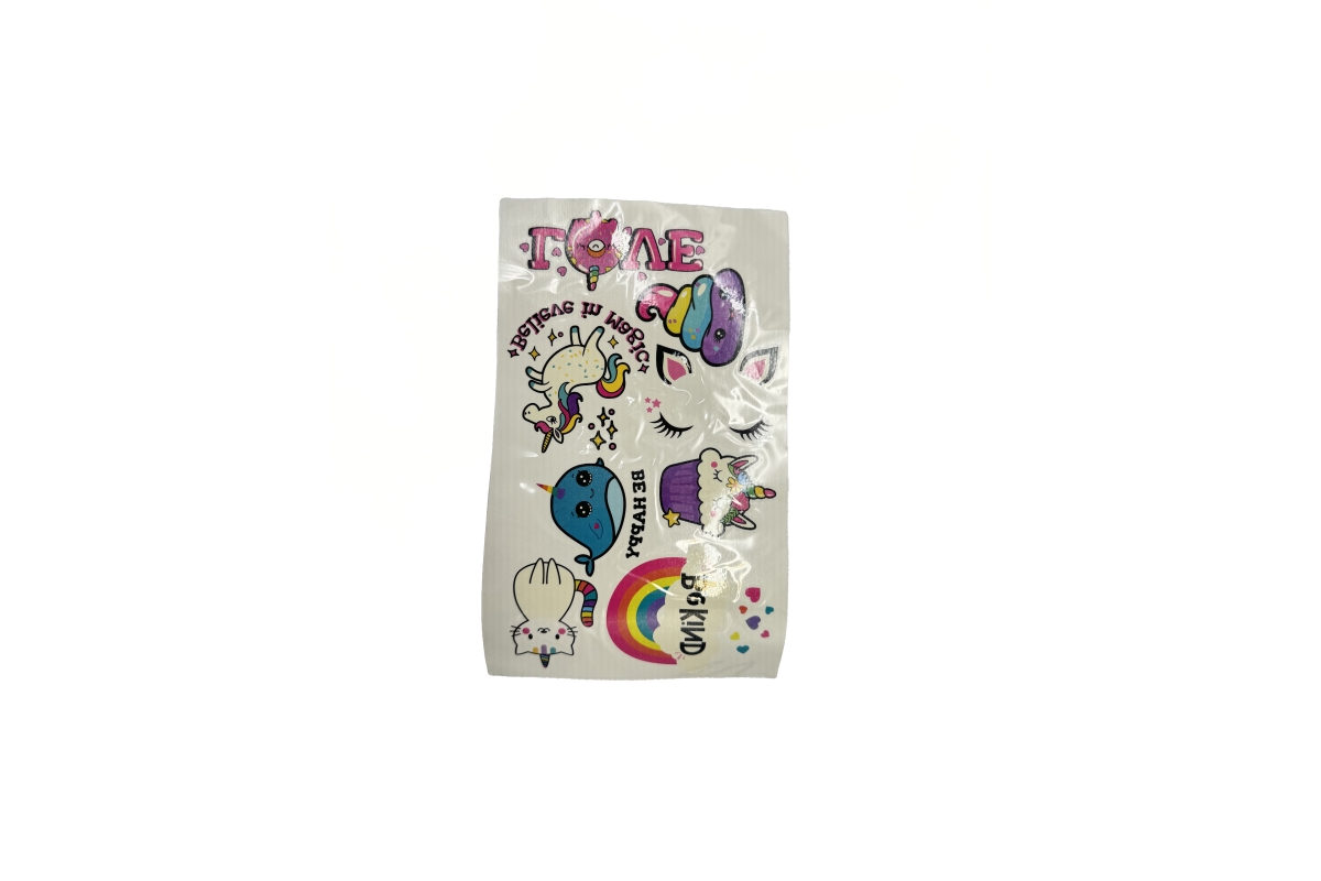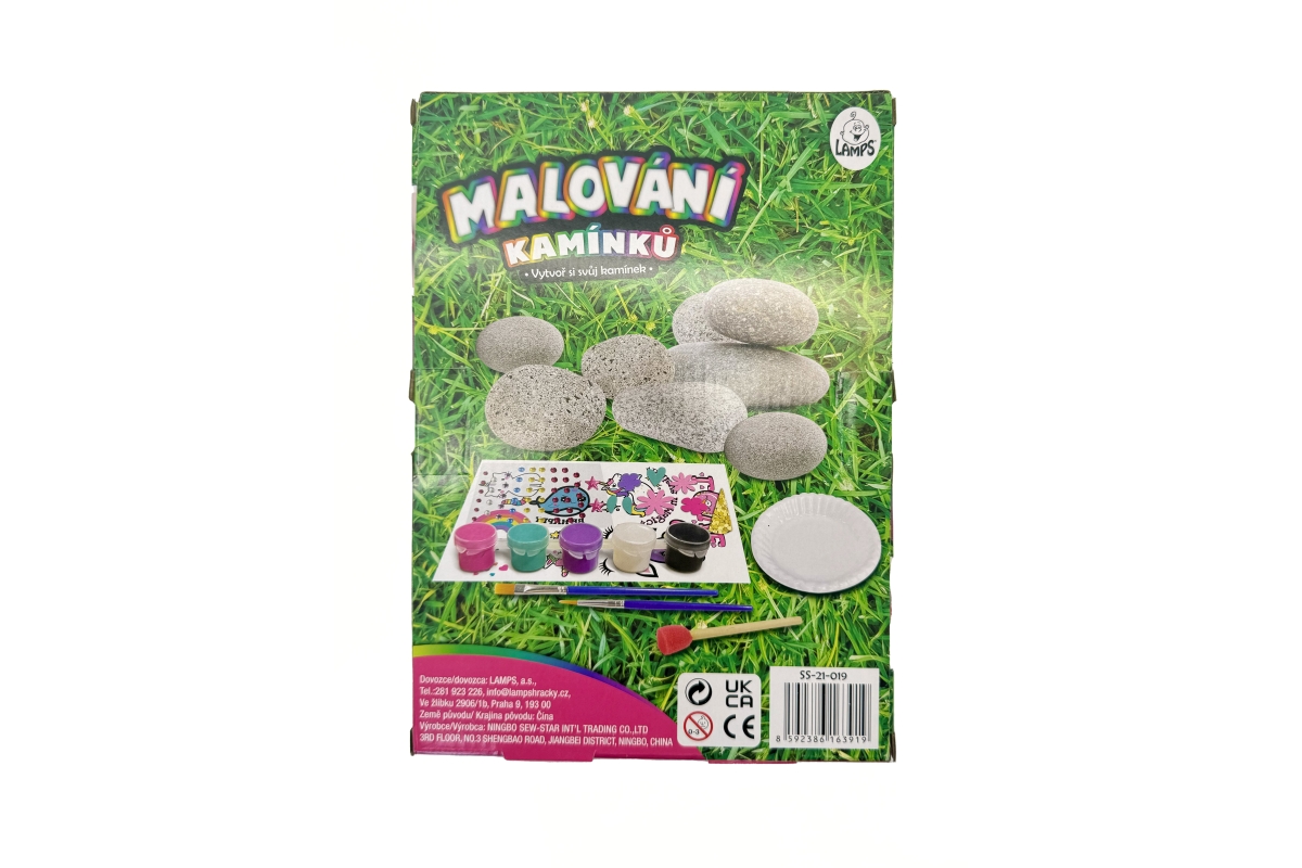 Obsah balení: 8x kamínek, 5x barva, 52x lepící drahokam, 7x samolepka, 1x samolepící flitrová dekorace, 1x arch tetovaček, 1x miska, 2x štětec, 1x tupovací houbička, návod.