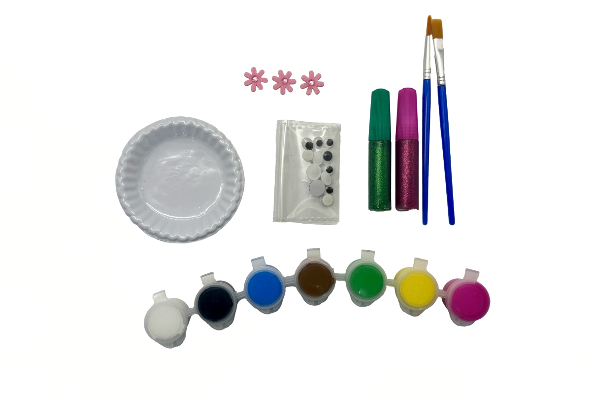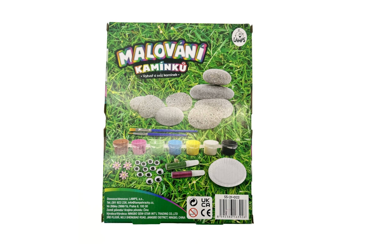 Obsah balení: 8x kamínek, 7x barva, 2x lahvička třpytivého lepidla, 12x pohyblivé oči, 3x nalepovací květina, 1x miska, 2x štětec.