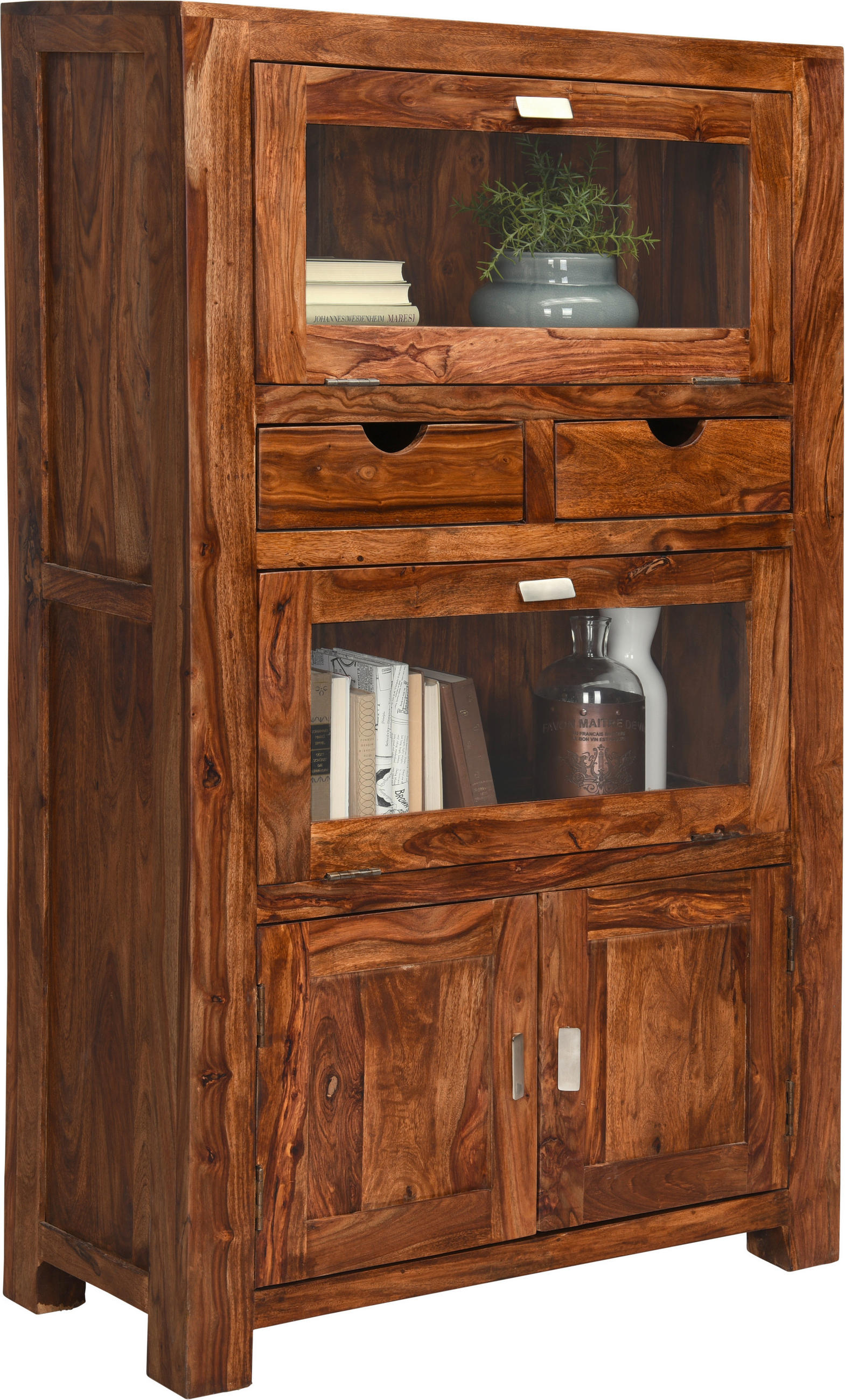 V této vitríně od značky LANDSCAPE vystavíte na odiv svůj nejlepší porcelán. Vitrína je vyrobena z masivního dřeva Sheesham: záruka nejvyšší kvality a dlouhé životnosti. Elegantní přírodní vzhled propůjčí Vaší jídelně neopakovatelný půvab. Ve 2 zásuvkách a za 2 otočnými dveřmi najdete dostatek místa pro vše: ubrusy, příbory i talíře budou bezpečně uloženy a kdykoli připraveny k použití. Díky 2 proskleným policím budete mít svůj výstavní krásný servis vždy na očích. Propůjčte svému domovu rustikální šarm s touto kvalitní vitrínou. – **TYP: 6507, – **SHISHAM DŘEVO NUGÁTOVÁ, – **2 ZÁSUV.,2 DVEŘE,2 SKL.POLIC