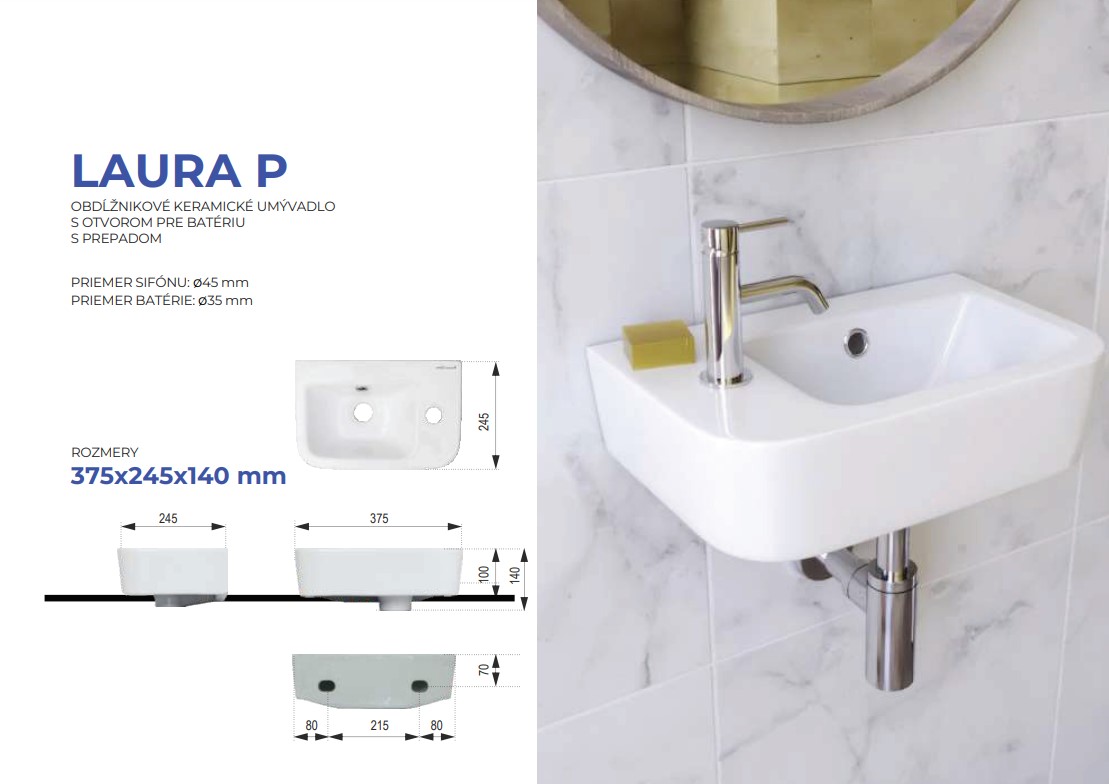 Mini keramické umyvadlo se zaoblenými rohy s otvorem pro baterii, sprepadem. otvor pro sifon: Ø 45 mm otvor pro baterii: Ø 35 mm umyvadlo na zeď s přepadem odchylka od uvedeného rozměru Max. : 0,5…