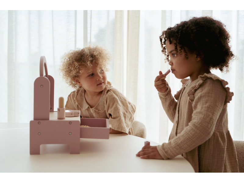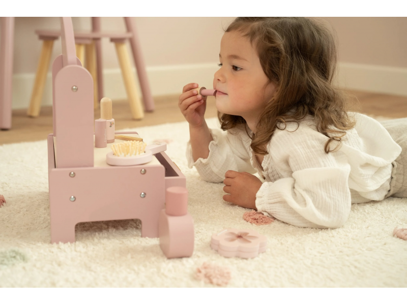 Toaletní stolek s doplňky v dřevěném provedení potěší malou parádnici a stane se i krásnou dekorací v dětském pokoji.