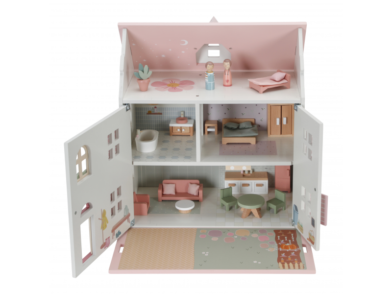 V domečku pro panenky najdete dvě dřevěné panenky Jima a Rosu, obývací pokoj, kuchyň, koupelnu, ložnici a dětský pokoj. Každý pokoj je zařízen odpovídajícím nábytkem a doplňky. K domečku je možné dokoupit další sady nábytku, domácí mazlíčky apod.