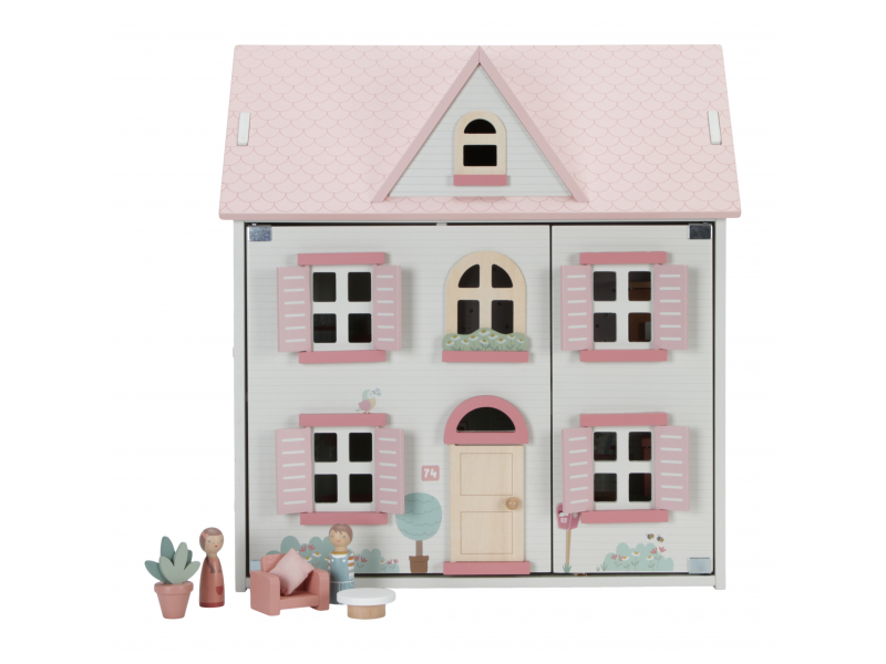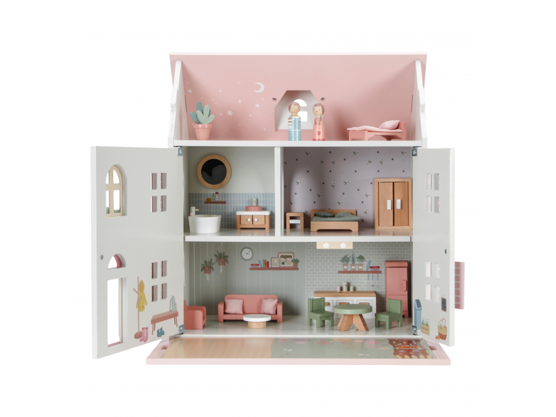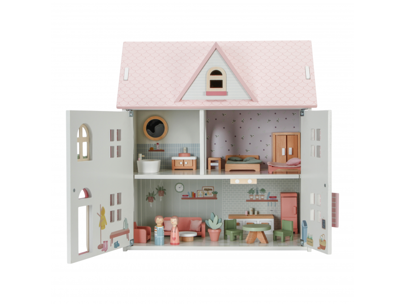 V domečku pro panenky najdete dvě dřevěné panenky Jima a Rosu, obývací pokoj, kuchyň, koupelnu, ložnici a dětský pokoj. Každý pokoj je zařízen odpovídajícím nábytkem a doplňky. K domečku je možné dokoupit další sady nábytku, domácí mazlíčky apod.