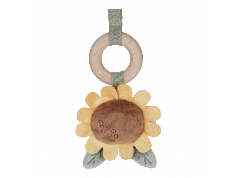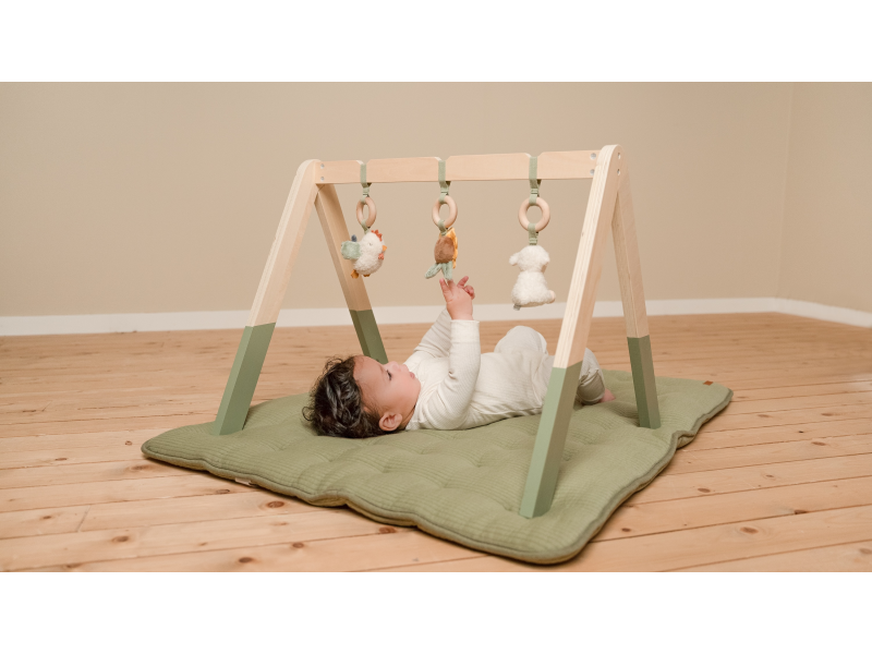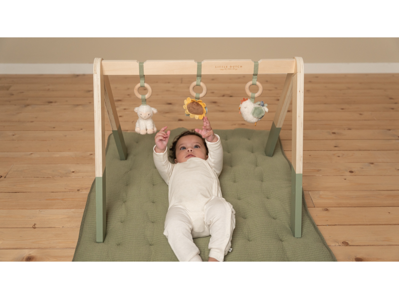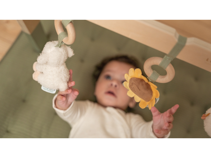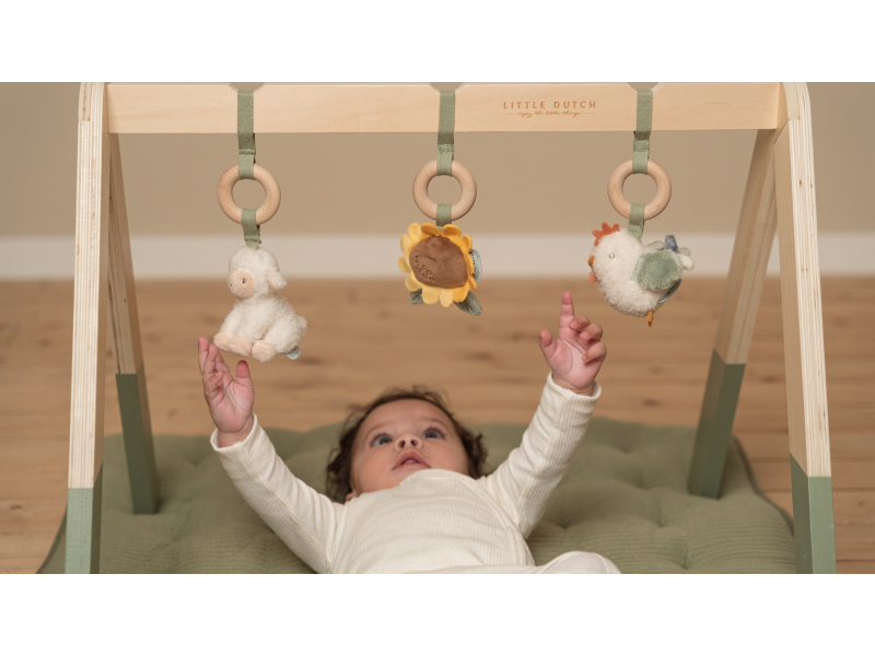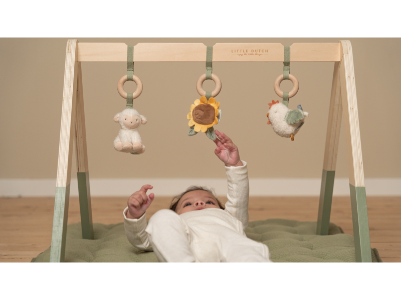 Dřevěná hrazdička se zavěšenými plyšovými hračkami v podobě ovečky, ptáčka a slunečnice vzbudí zájem u každého miminka. Jednotlivé hračky lákají dítě ke zkoumání a dotýkání, při pohybu chrastí a šustí. Hrazda je vyrobena z vysoce kvalitního odolného dřeva. Odnímatelné hračky je možné používat i samostatně.