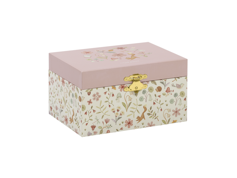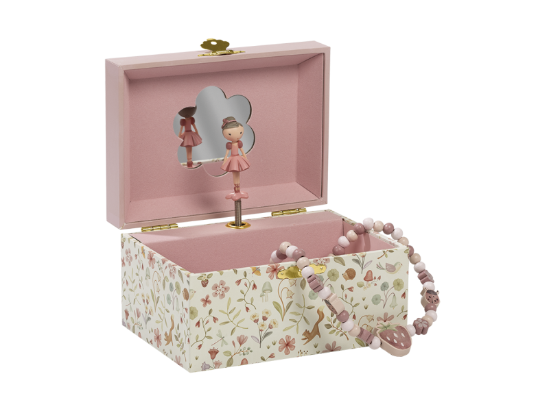 Krásná šperkovnice se zrcátkem a hudebním boxem, který po natažení hraje něžnou melodii. Vaše malá parádnice si do šperkovnice s potiskem květin může ukládat své šperky a jiné vzácné drobnosti.