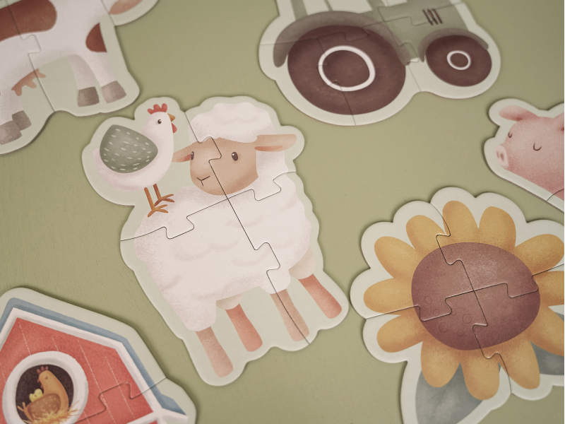 Jedna krabička a v ní hned 6 různých puzzle pro děti. Jednotlivé skládačky mají 3, 4 nebo 5 dílků z pevného kartonu, které jsou dokonale tvarované pro malé dětské ručičky. Puzzle rozvíjí jemnou motoriku dítěte i dovednosti jako řešení problémů, trpělivost a rozpoznávání tvarů.