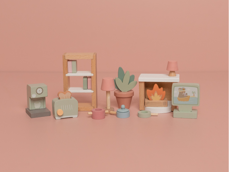 Sada doplňků do obývacího pokoje a kuchyně v krásném dřevěném provedení vhodně doplňuje vybavení dřevěného domečku pro panenky Little Dutch. Dřevěné hračky se těší velké oblibě u dětí i rodičů a s těmito si užijete dlouhé chvíle plné zábavy.