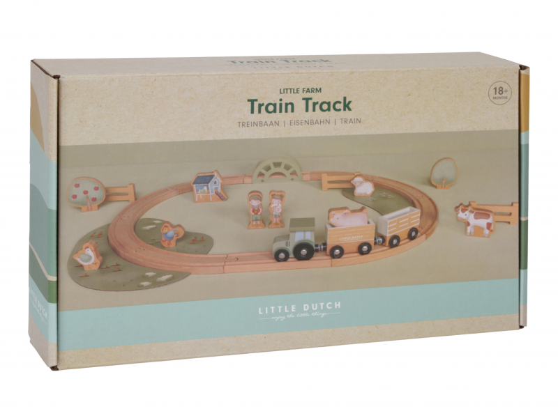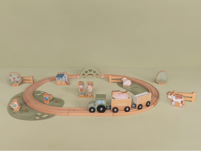 Sada obsahuje 10 dílů kolejí, mašinku (traktor) se dvěma vagóny a 13 dalších doplňků ze života na farmě. Farma, postavičky, zvířátka i stromy jsou oboustranně potištěné. Zvířátka mají velikost vhodnou pro naložení do vagónů, aby mohla vyrazit na výlet vlakem.