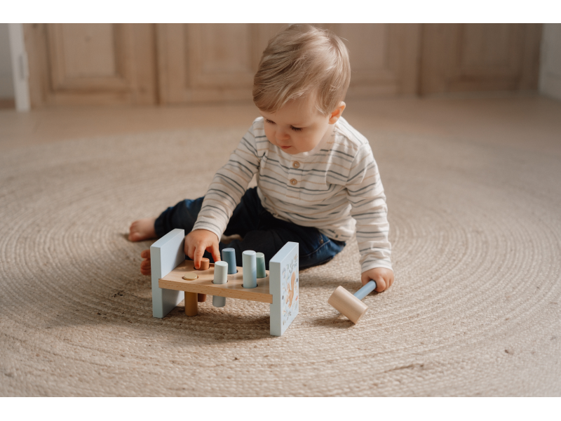 Pomocí kladívka je potřeba zatlouct 6 barevných kolíků do dřevěného stojanu, který je vyzdoben překrásnými lesními zvířátky. Až se to podaří, stačí stojan otočit a můžete začít znovu! Můžete zatloukat pořád dokola!
