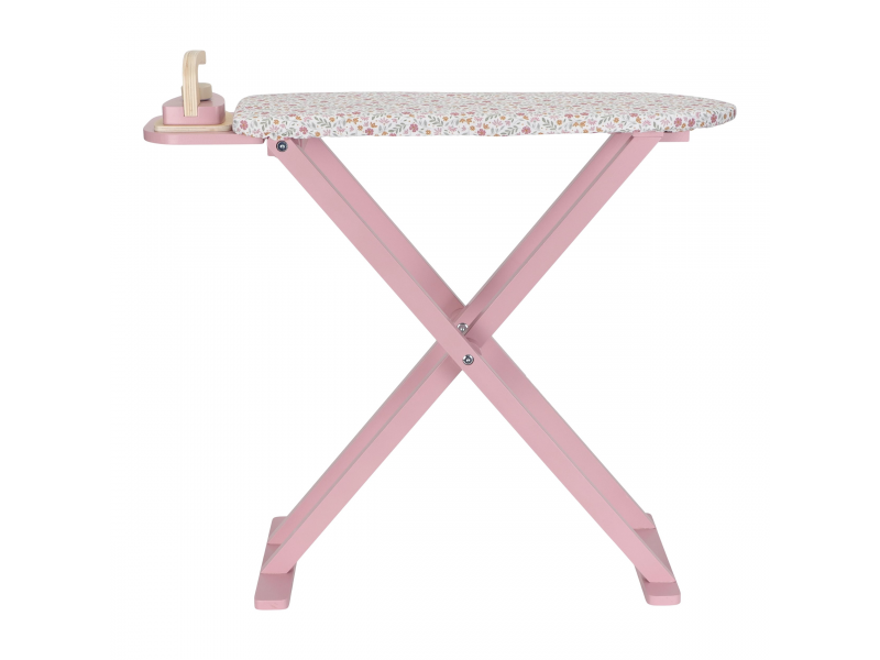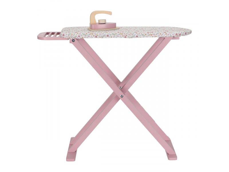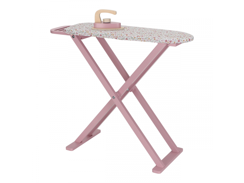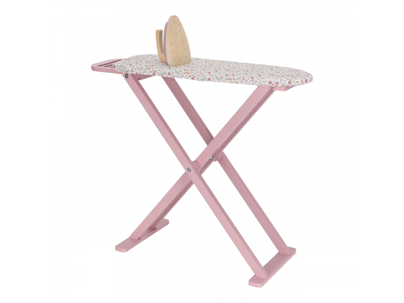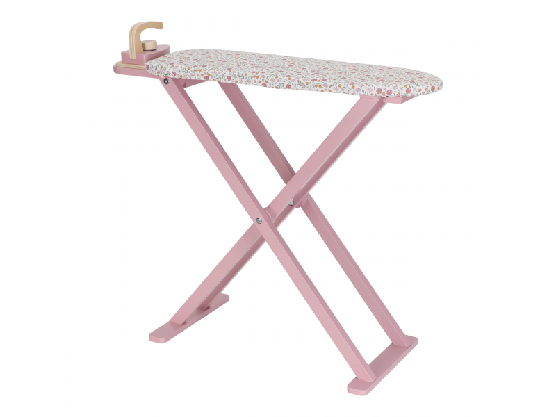 Žehlení oblečení panenkám bude radost s tímto krásným dřevěným žehlicím prknem a žehličkou. Skládací prkno je s textilním potahem s něžným květinovým potiskem vypadá jako opravdové, realisticky působí i barevně sladěná dřevěná žehlička.