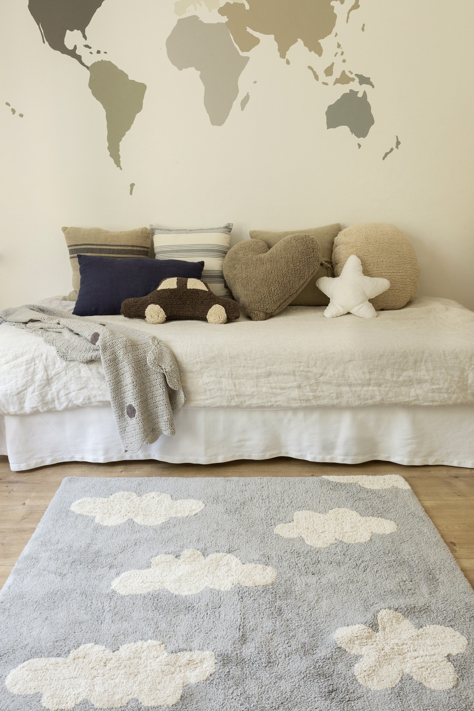 Na koberci s motivem mraků se budou děti při hře cítit pohodlně jako na obláčku. Měkký a hebký koberec v nadčasové šedé barvě vykouzlí v pokojíčku příjemnou a útulnou atmosféru. Zásluhou jednoduchého vzoru bez výrazných barev si u vás koberec najde místo na dlouhé roky.