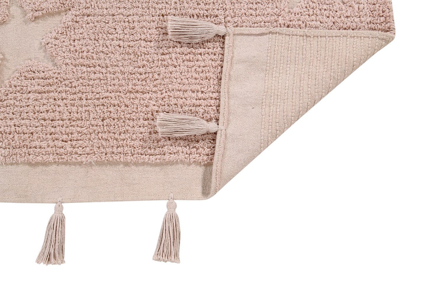 Každý kus originálního koberce ve starorůžové barvě je ručně vyroben udržitelným způsobem za použití přírodních vláken, recyklovaných materiálů a netoxických barviv. Zásluhou ruční výroby se na každém koberci nachází jemné odchylky a můžete tak vlastnit 100% originál. Na podkladu koberce bylo ponecháno několik netkaných ploch ve tvaru hvězd, které společně s prošíváním v různých vzdálenostech vytváří velmi originální směs textur a reliéfů, která dodává tomuto designu jedinečnost.