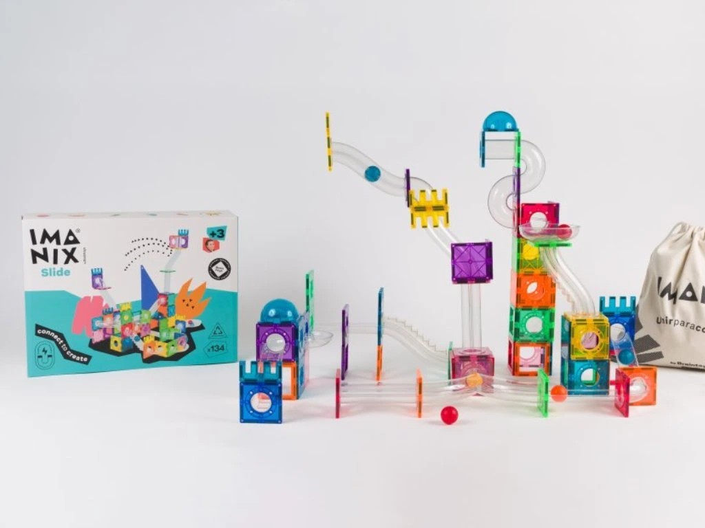 Magnetická stavebnice Imanix Slide nabídne dětem 134 dílů pro hraní a stavění. Součástí sady jsou kromě klasických dílů s magnety také různě tvarované průhledné tunely pro stavbu kuličkové dráhy. Děti mohou pomocí dílů a tunelů vytvořit nekonečné množství drah. Skládačka Imanix umožňuje dětem stavět 2D a 3D tvary a mohou tak krásně rozvíjet fantazii, kreativitu a také týmovou spolupráci v případě, že si ke stavění přiberou parťáka v podobě sourozence, rodiče nebo kamaráda.