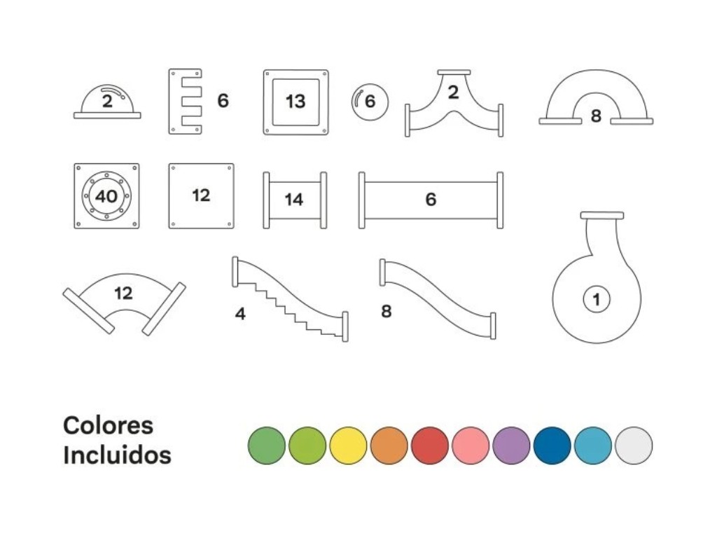 Obsah balení: 134 ks (kuličky, kuličková kopule, poloviční skluzavky, zakřivené skluzavky, kruhová okna, otočné skluzavky, skluzavky s rampou, stupňovité skluzavky, dlouhé rovné skluzavky).