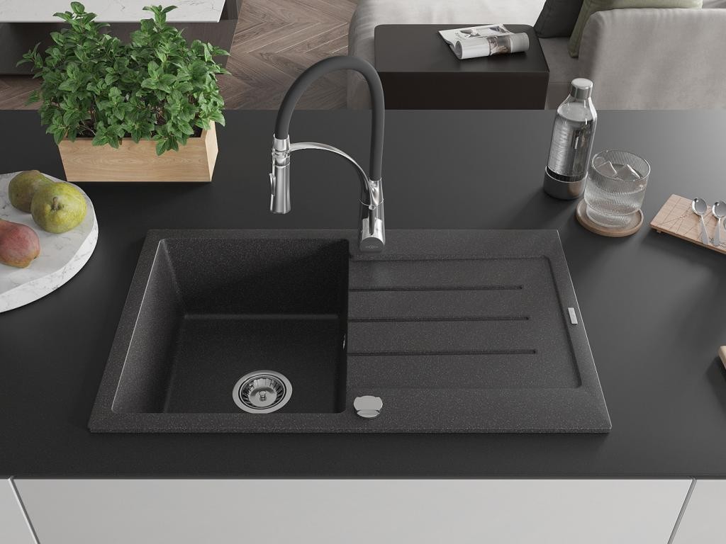 Technická data: dřez: Rozměr: 795 x 495 x 200 mm Hloubka komory: 200 mm Rozměry komory: 440×360 mm Průměr odtoku: ø90 mm Typ: 1-miska s odkapávačem Typ: Zapuštěné do pracovní desky Barva: Skvrnitá černá Povrchová…
