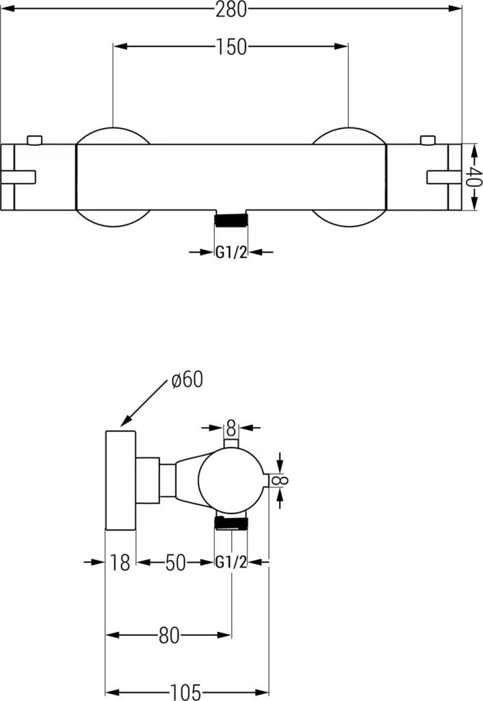 Technická data: Materiál: Tělo z mosazi Hlava: termostatická Připojení sprchy G 1/2 “ Blokování horké vody při 38 ° C Barva: chrom