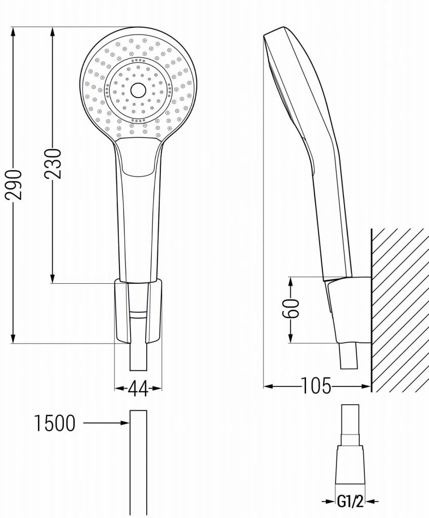 Technická data: Materiál sluchátek: plast Povrchová úprava sluchátek: chrom / bílá Počet funkcí: 3 Připojení: G 1/2 “ Výška sluchátka: 230 mm Rozměry hlavy: ø108 mm Materiál rukojeti: plast Povrchová úprava rukojeti: chrom Typ montáže: Nástěnný Rozměry rukojeti: 60×44 mm Vzdálenost od stěny: 42 mm Materiál hadice: PVC Povrchová úprava hadice: chrom Délka hadice: 150 cm Připojení: 1/2 “ Mosazné hroty Hladký povrch usnadňuje udržování čistoty Otočné hroty zabraňují kroucení Pružný materiál odolný…