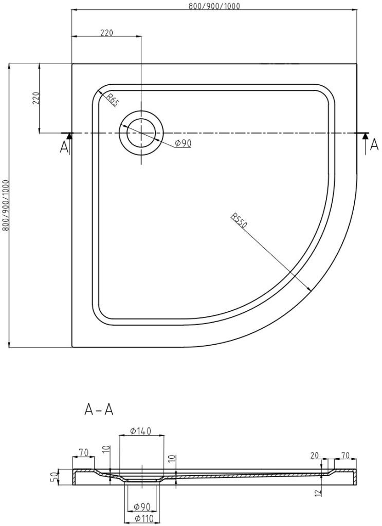 Technická data: Velikost: 90 x 90 x 5 cm Černá barva Typ: půlkruhový, tenký Materiál: Sanitární akryl Zesílené dno Kompletní se sifonem vyčištěným shora Průměr odtoku: 90 mm Korková povrchová úprava: chrom