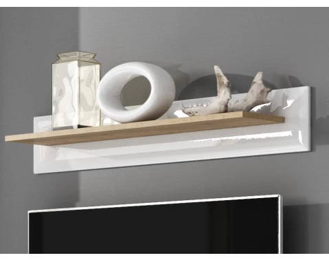 Nástěnná police z kolekce Nordi – inspirujte se útulným severským stylem. Moderní nábytek se zaoblenými hranami v kombinaci dub/bílá lesk.