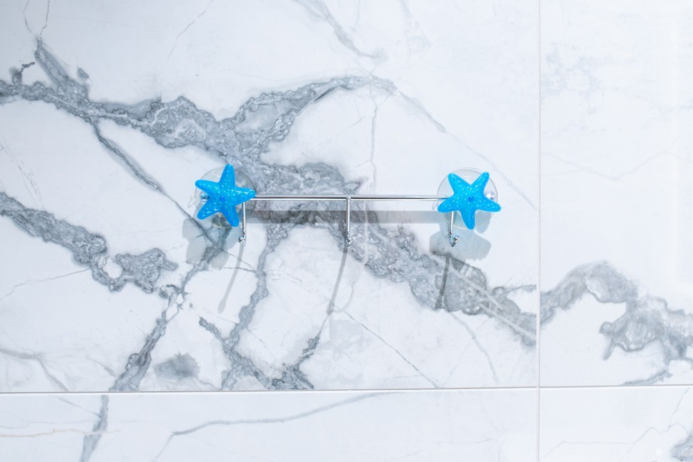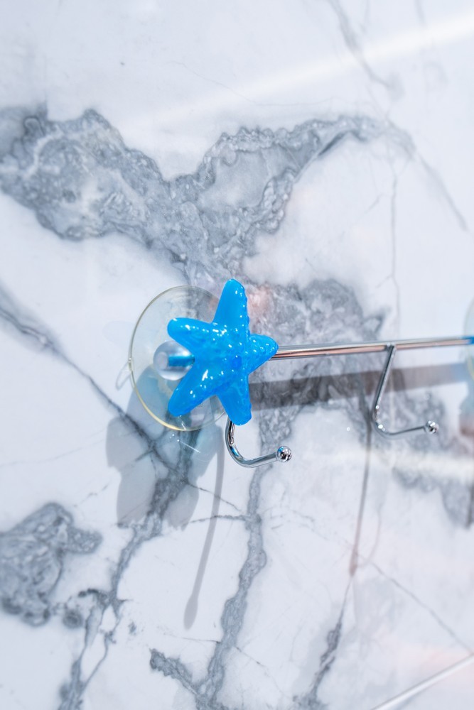 Koupelnový věšák se třemi háčky upevněnými na ozdobných přísavkách s modrými mořskými hvězdami.