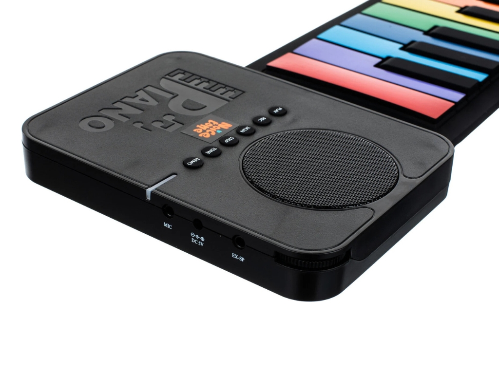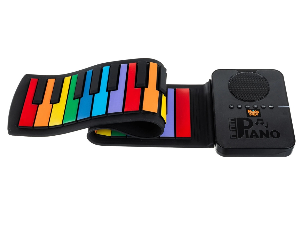 Veselé barvy pro dětiPodpora kreativity a zábavyBarevný design rolovacího klavíru přitahuje pozornost dětí a zaujme je hned na první pohled. Hra na klávesy se tak stává zábavnou aktivitou, která podporuje jejich fantazii a kreativitu.Při hraní děti procvičují jemnou motoriku, učí se rytmus, melodii a rozvíjí hudební sluch. Klavír zároveň podporuje koncentraci a hudební cítění, to přispívá k jejich celkovému rozvoji a radosti z tvoření vlastní hudby.Praktické příslušenství pro malé hudebníkyFlexibilní napájení a mobilitaRolovací klavír je vybaven 10 vestavěnými zvuky, funkcí nahrávání a vstupem pro mikrofon, takže děti mohou zpívat při hraní a nahrávat své vlastní skladby. Díky 3,5 mm stereo jacku lze používat sluchátka, což umožňuje cvičit potichu a nerušit okolí.Klavír je napájen AAA bateriemi nebo přes USB 5V adaptér. Součástí balení je USB kabel, manuál a praktická přenosná taška, díky čemuž mohou děti hrát a tvořit hudbu kdekoliv – doma, na výletě i u kamaráda.Technické parametryObsah baleníklávesy, USB kabel, manuál, taška na přenášení
