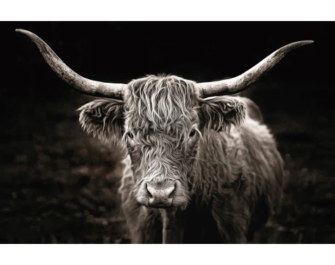 Obraz na plátně 90×60 cm s motivem skotské krávy v monochromatickém provedení se stane nepřehlédnutou dekorací každého interiéru.