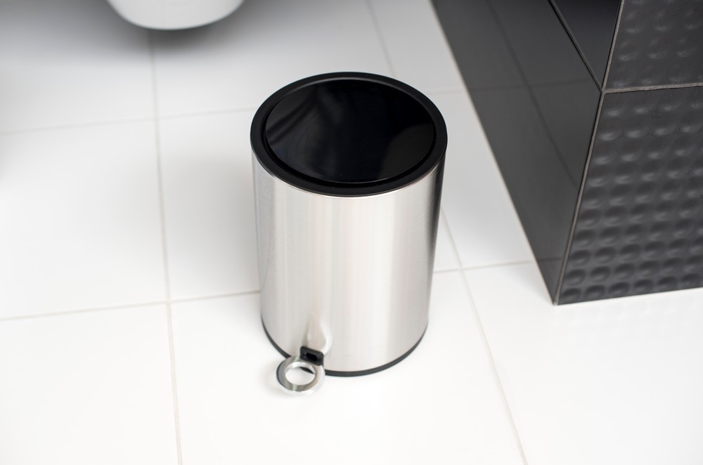 Odpadkový koš o objemu 3 litry. Má systém pomalého zavírání víka. Jeho boční stěny jsou vyrobeny ze saténově stříbrné nerezové oceli.