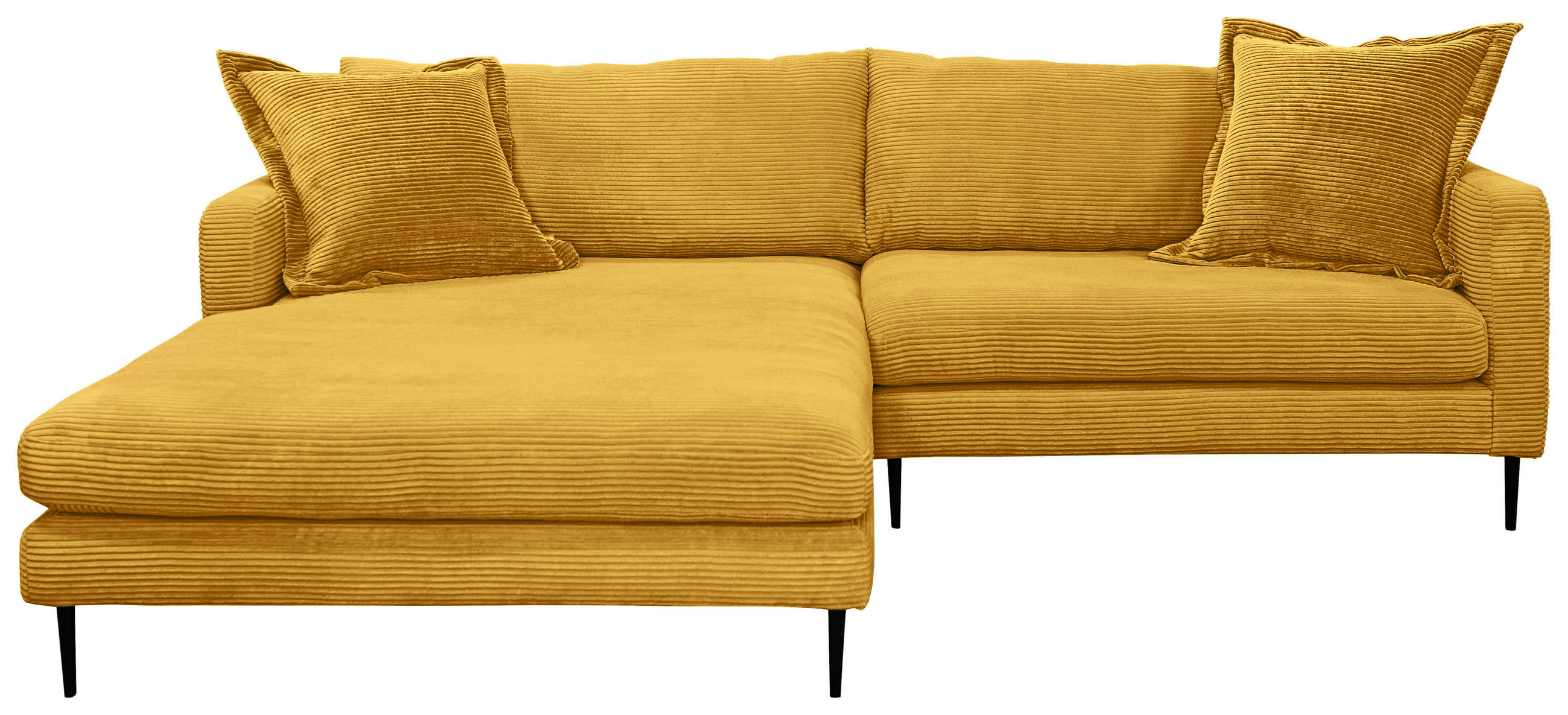 Tato pohodlná rohová sedačka v hořčicově žluté barvě je ideálním společníkem pro chvíle, kdy se chystáte ne tak úplně aktivně odpočívat. Základní informace přehledně: ve tvaru L: cca 193 x 268 cm (rozměr rohu) výška: cca 96 cm počet míst k sezení: cca 2 sedací plocha: cca 240 x 62 cm (Š x H), výška sedáku: cca 44 cm max. nosnost: cca 240 kg max. nosnost každého sedáku: cca 120 kg područky: cca 100 x 48 cm (Š x V) výška nohy: cca 15 cm opěrný polštář: cca 120 x 75 x 12 cm (D x Š x V) dekorační polštář: cca 75 x 75 cm (D x Š) V hlavní roli komfort Povrchová úprava manšestr (92% polyester, 8% nylon) je velmi příjemná na dotek a přirozeně prodyšná. O váš komfort se dále postará její kvalitní pěnové čalounění s vlnkovým pružicím roštem, které tělu zajistí optimální oporu a brání přílišnému zaboření. Upoutá pozornost Odstín hořčicově žluté vytvoří stylový základ vaší obývací zóny. Celkový vizuální dojem vašeho nového oblíbeného kusu nábytku dotváří jeho umístění na kuželovitých nožkách z kovu v černé barvě. Cena zahrnuje: opěrný polštář dekorační polštář Pořiďte si konečně místo, kde můžete vypnout, s touto pohodlnou rohovou sedačkou P & B v hořčicově žluté barvě a objednejte si ji výhodně online ještě dnes! – BEZ: ZOOM 09 MUSTARD, – FÜ: METALL SCHWARZ, – INKL. 2 ZIERKISSEN, OTM LI