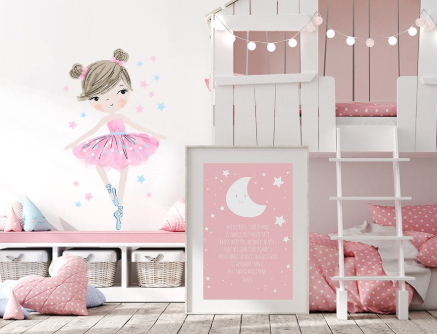 A proč nepřenášet trochu této magie do pokojů vašich dětí? Není nic jednoduššího. Naše samolepka baleríny způsobí, že se každá dívka bude cítit jako na velké scéně ve fenomenálním oblečení. Nálepka je natištěna na nejkvalitnější fólii pokryté matným laminátem, který chrání před poškrábáním, vyrobený s maximální péčí a pozorností k detailům. Samolepky na zeď nemají pozadí – jsou vystřiženy na obrysu, což znamená, že je můžete nalepit na zeď v jakékoli barvě.
