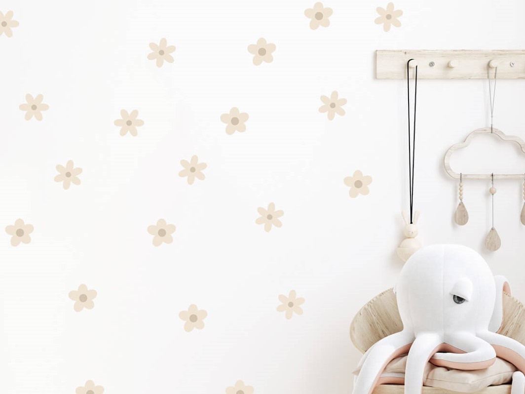 Sada nálepek na zeď s motivem květin, v jemných odstínech hnědé, snadno a elegantně vyzdobí každou místnost, nejen dětský pokojíček. Tato jedinečná sada samolepek na stěnu s nádherným vzorem sedmikrásek a květů vnese do vašeho pokojíčku nádech přírody. Nálepka na zeď je opatřena speciálním matným laminátem, který ji chrání před poškrábáním při každodenním používání, a také usnadňuje lepení – film je tlustší a snadněji se přenáší na stěnu.