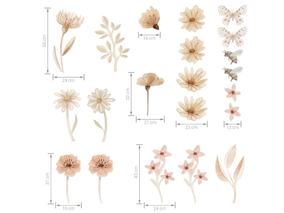 Obsah balení: Velké květy (10 ks), malé květy (7 ks), motýli (2 ks), včely (2 ks).