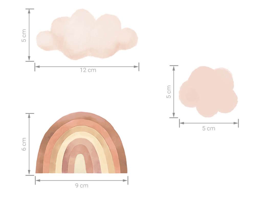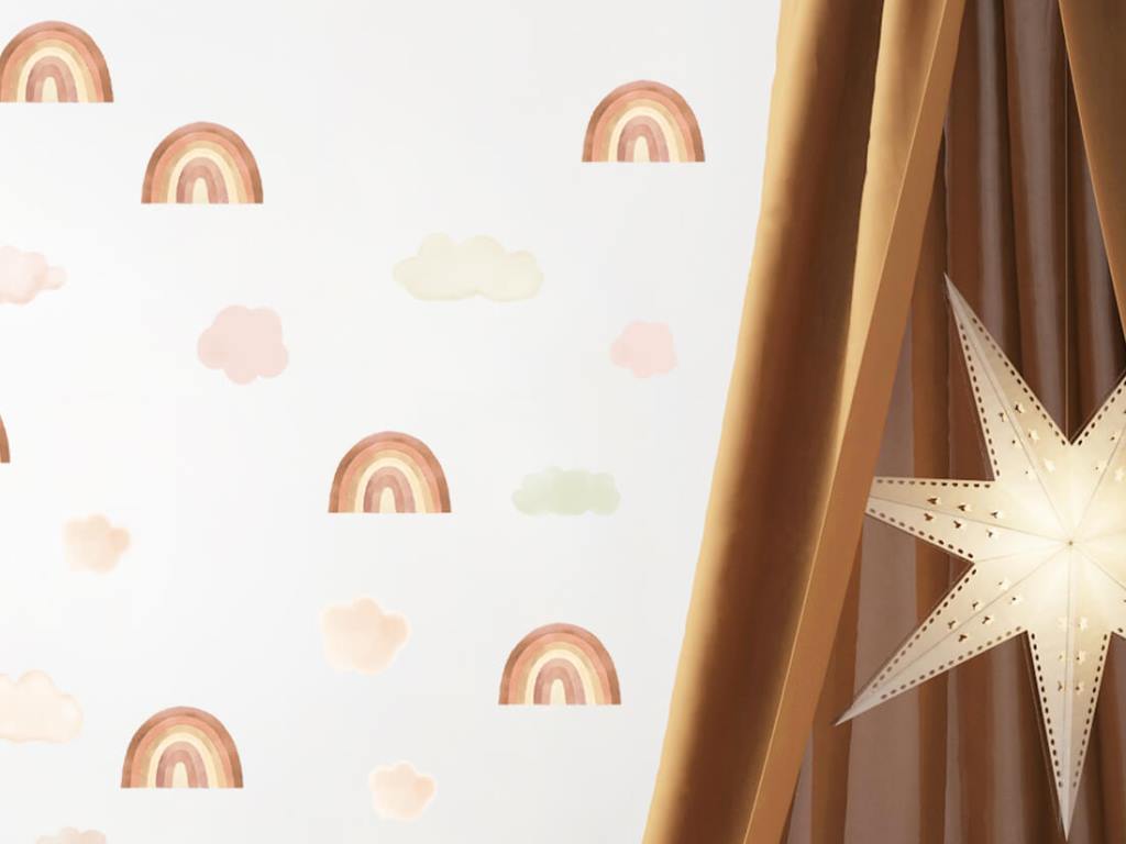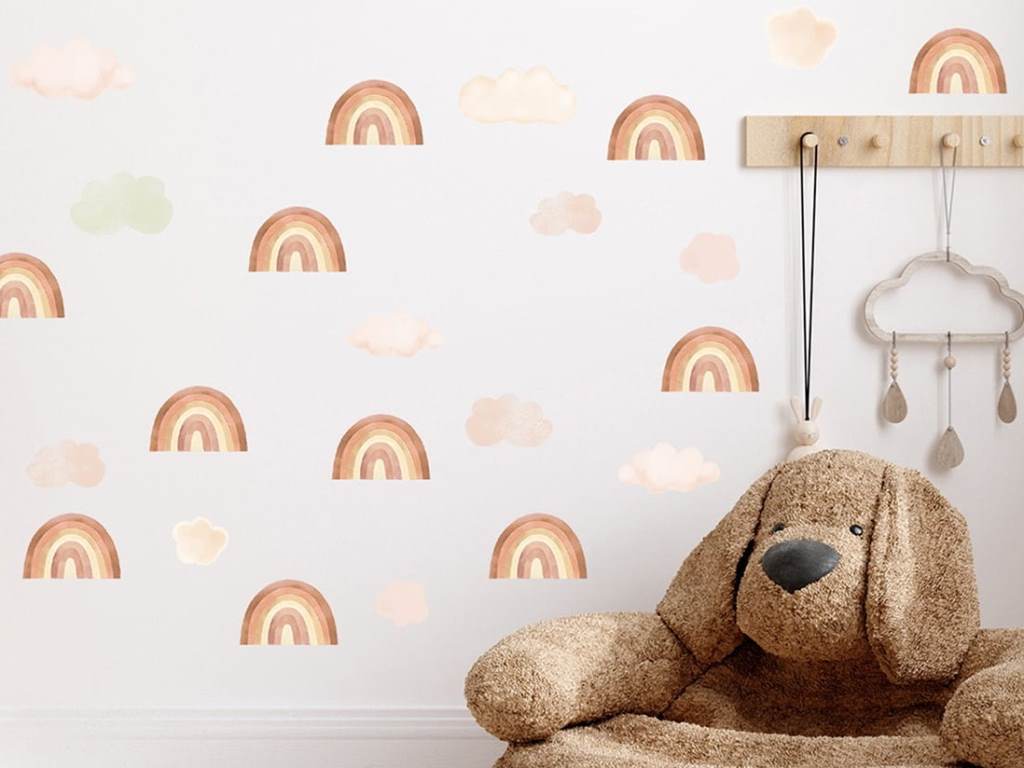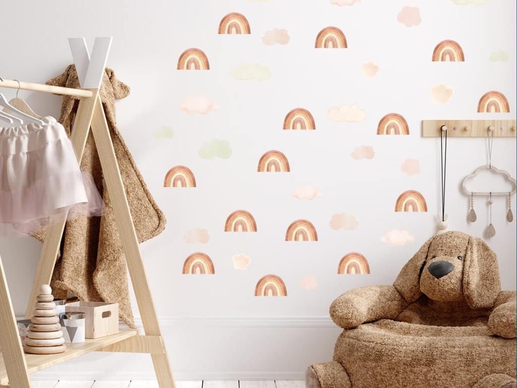 Samolepka na zeď s motivem čarokrásných duh a nadýchaných mráčků je to pravé, čím oživit váš dětský pokoj nebo hrací koutek. Pastelové barvy duh v podobě světlých a tmavších odstínů hnědé, modré a růžové si spolu náramně rozumí a vytváří výjimečnou dekoraci do holčičího i klučičího pokoje. Nálepka na stěnu je vyrobena v nejvyšší kvalitě a je opatřena speciálním matným laminátem, který ji chrání před poškrábáním při každodenním používání, a také usnadňuje lepení – film je tlustší a snadněji se přenáší na stěnu. Samolepku lze nalepit i na všechny hladké povrchy, jako je nábytek, sklo nebo zrcadla.