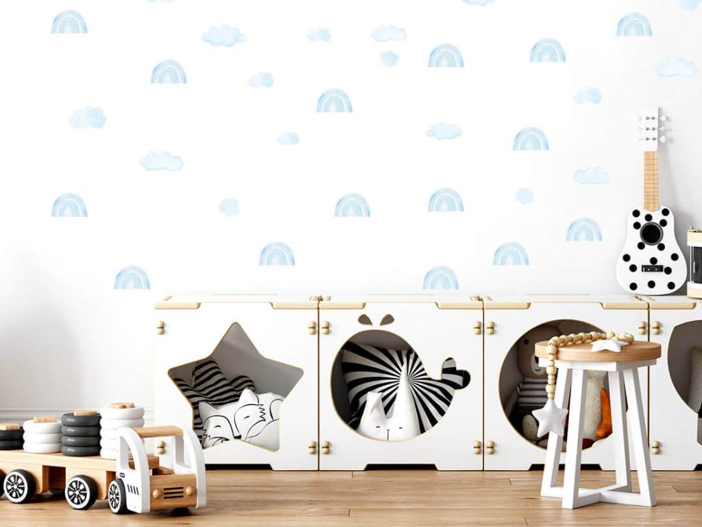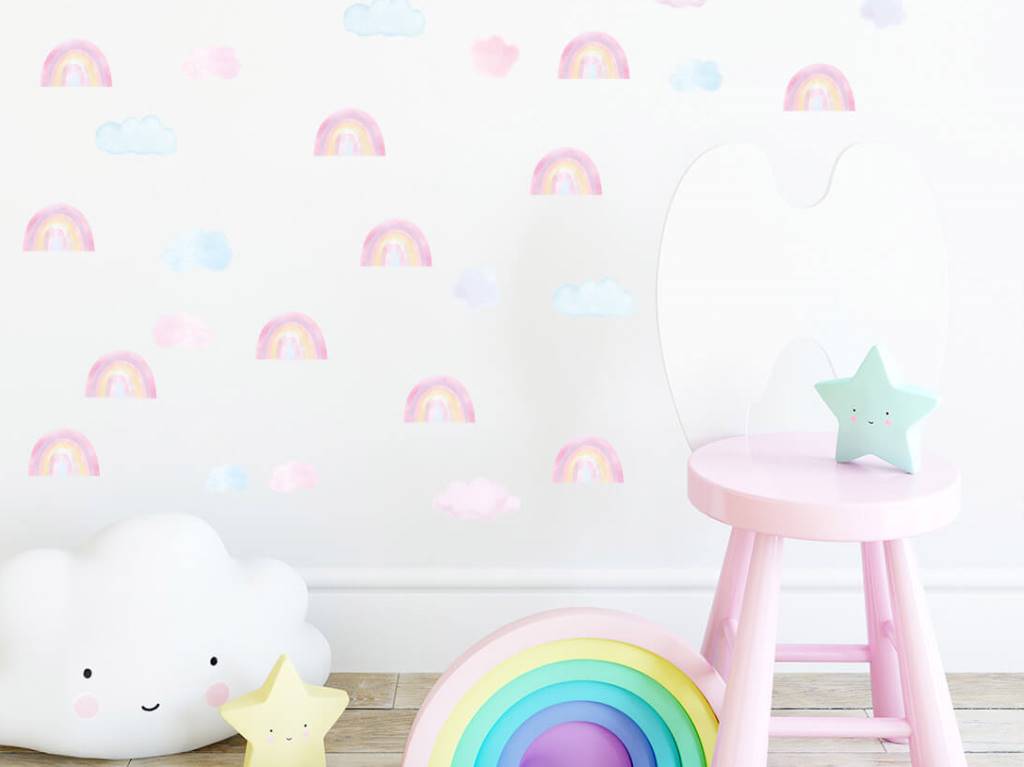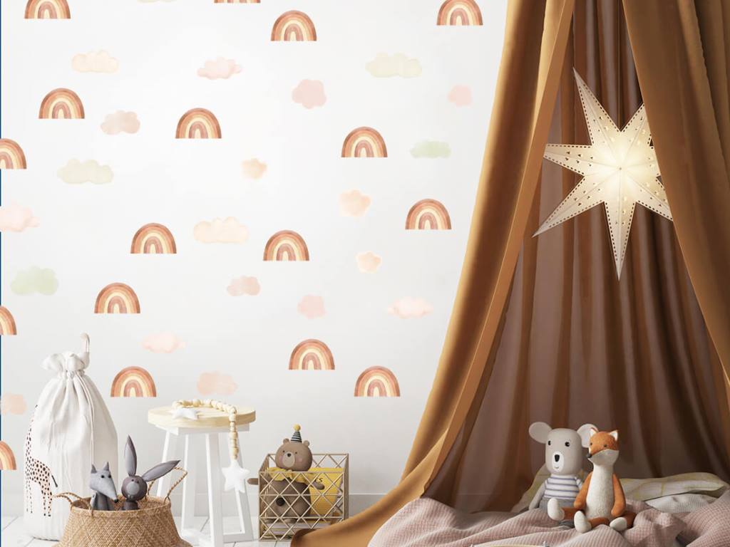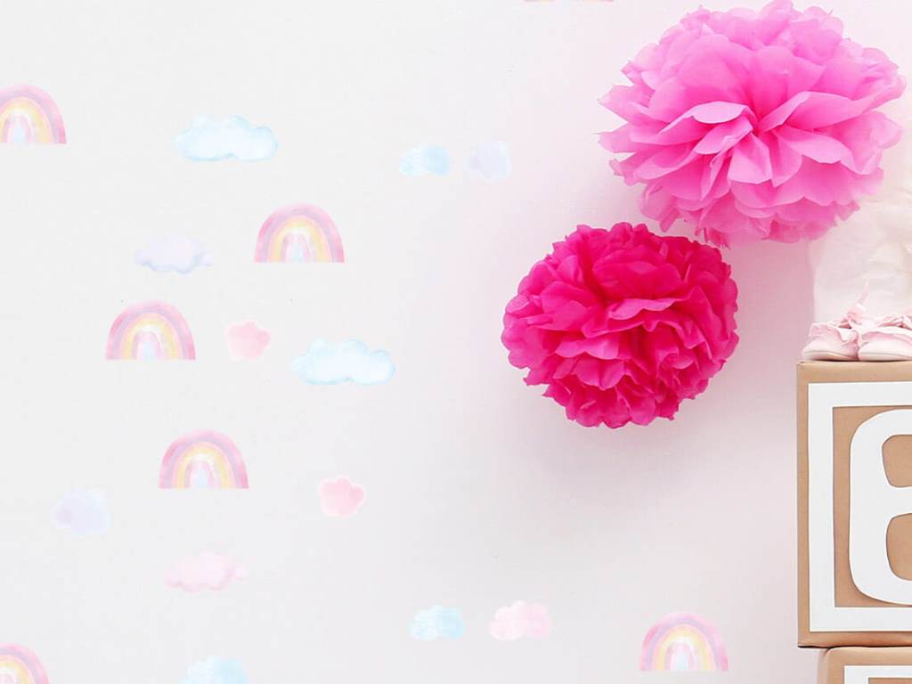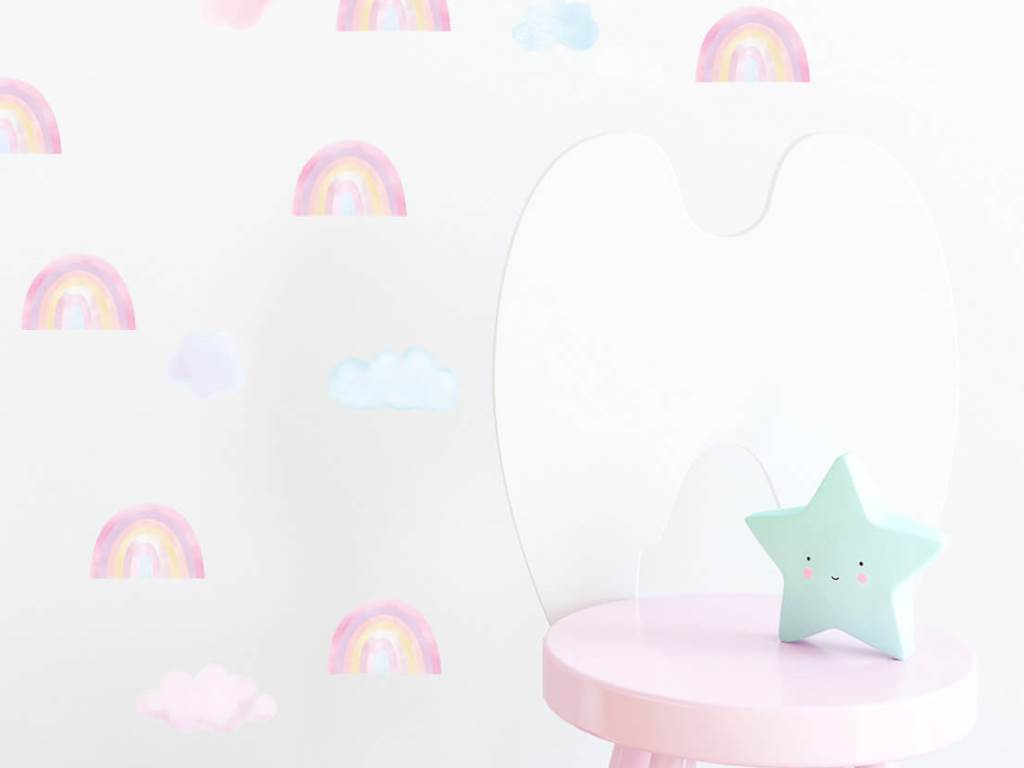 Samolepka na zeď s motivem čarokrásných duh a nadýchaných mráčků je to pravé, čím oživit váš dětský pokoj nebo hrací koutek. Pastelové barvy duh v podobě světlých a tmavších odstínů hnědé, modré a růžové si spolu náramně rozumí a vytváří výjimečnou dekoraci do holčičího i klučičího pokoje. Nálepka na stěnu je vyrobena v nejvyšší kvalitě a je opatřena speciálním matným laminátem, který ji chrání před poškrábáním při každodenním používání, a také usnadňuje lepení – film je tlustší a snadněji se přenáší na stěnu. Samolepku lze nalepit i na všechny hladké povrchy, jako je nábytek, sklo nebo zrcadla.