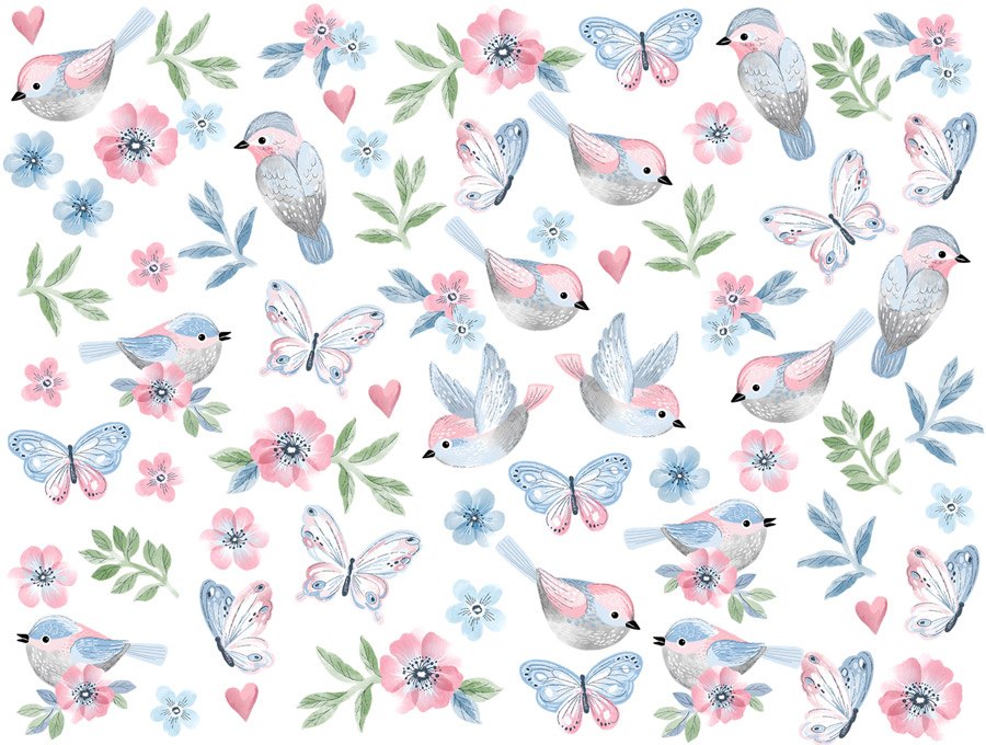 Sada nálepek obsahuje: 14 ptáků, 12 motýlů, 28 růžných druhů květin, 10 větviček, 6 srdcí.