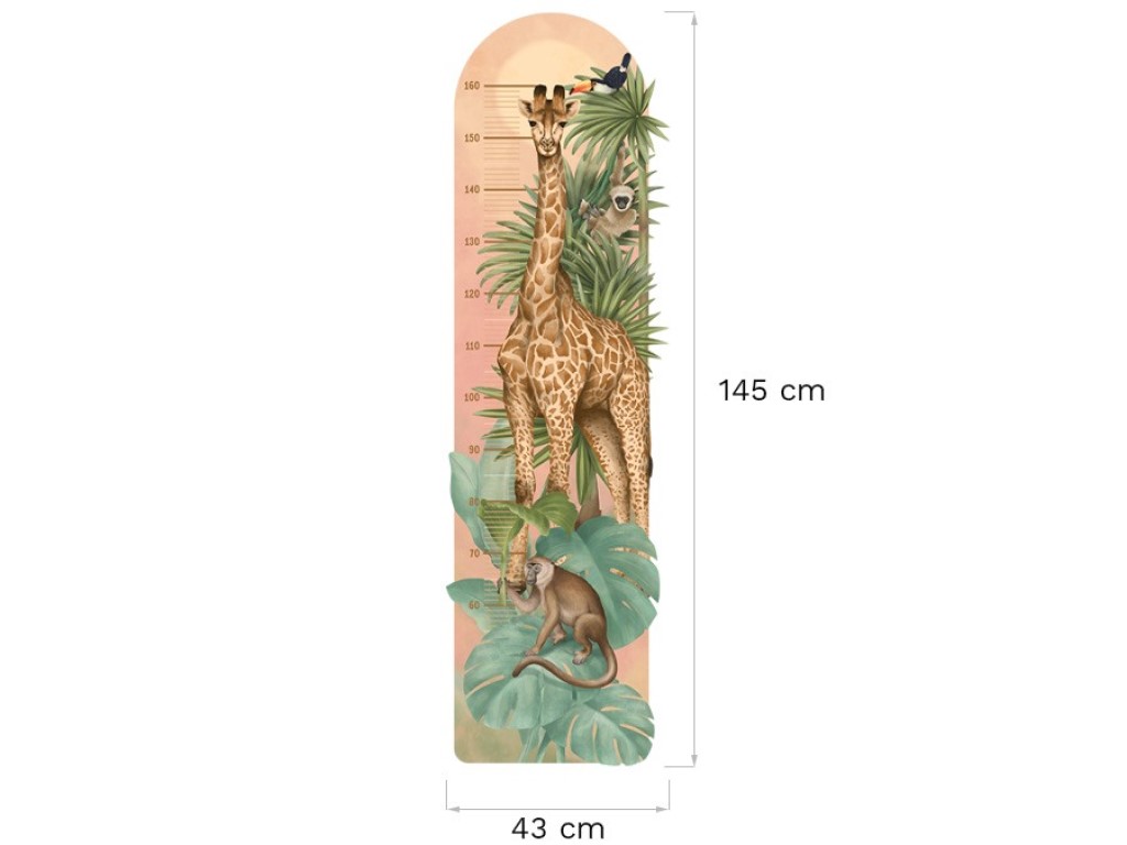 Děti rostou neskutečně rychle. Sledujte, jak rostou a zaznamenejte si jejich výšku na tomto krásném, ručně malovaném metru se žirafou, opičkami a tukanem doplněnými o exotické rostliny. Nálepka na stěnu dětského pokojíčku doladí klučičí i holčičí pokoj netradičním způsobem. Tato jedinečná dekorace v podobě nástěnného metru poroste s vašimi dětmi.