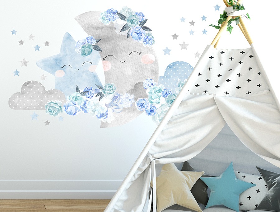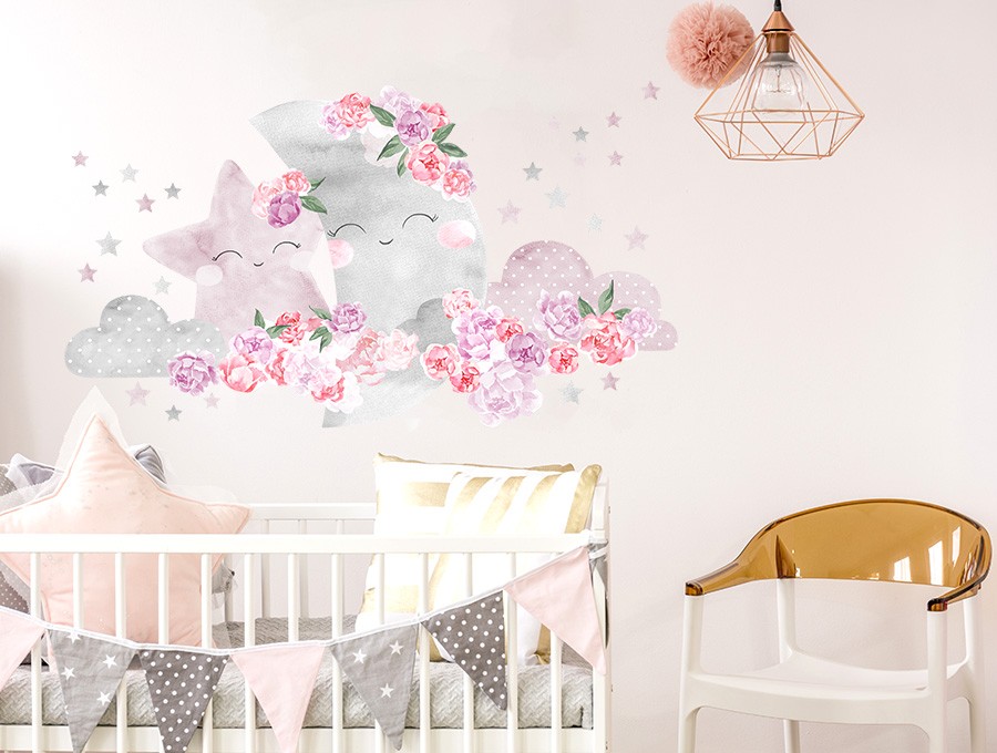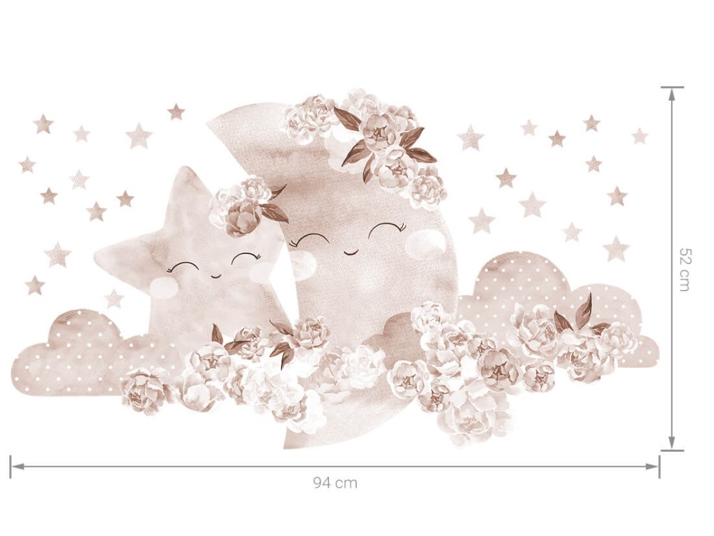 Nálepka na zeď s motivem noční oblohy, s měsíčkem a hvězdou podřimující na něžných obláčcích v záplavě pivoňkových květů, doplněná o malé hvězdičky, vnese pohodu a harmonii do každého dětského království. Vybírat můžete z více barevných variant, v barvách pro kluky, holky i v neutrálním béžovém BOHO stylu. Samolepka je opatřena speciálním matným laminátem, který ji chrání před poškrábáním při každodenním používání, a také usnadňuje lepení – film je tlustší a snadněji se přenáší na stěnu. Hvězdy jsou odděleny a mohou být nalepeny podle vlastního uvážení.