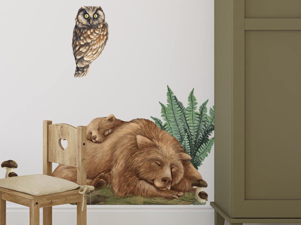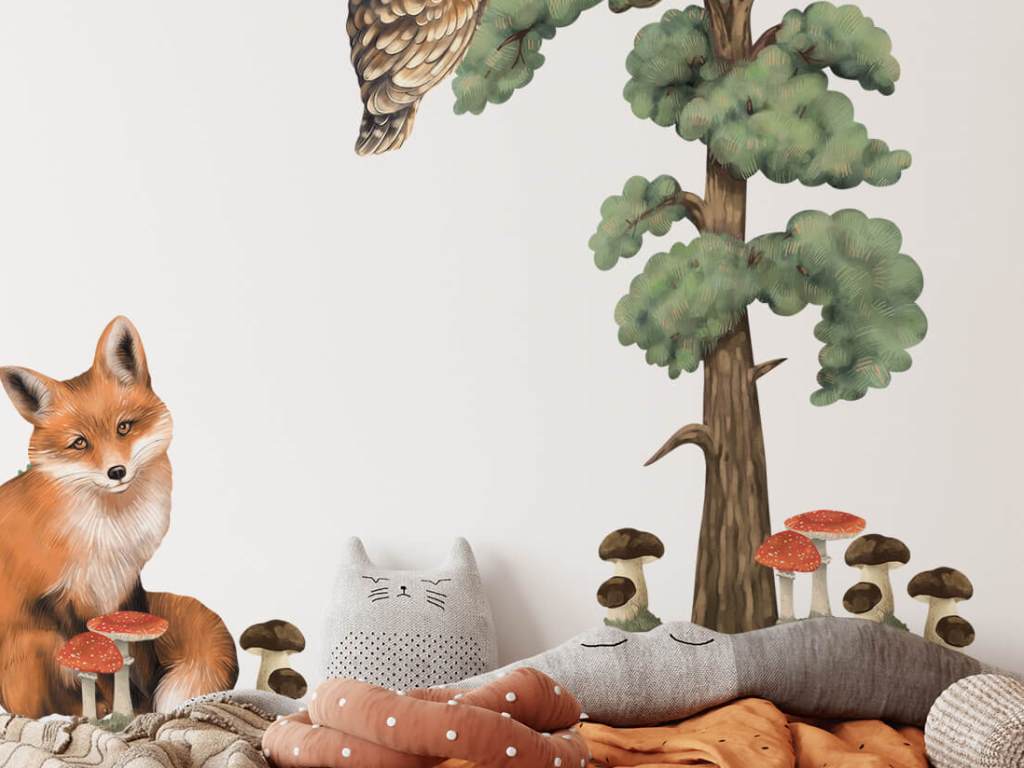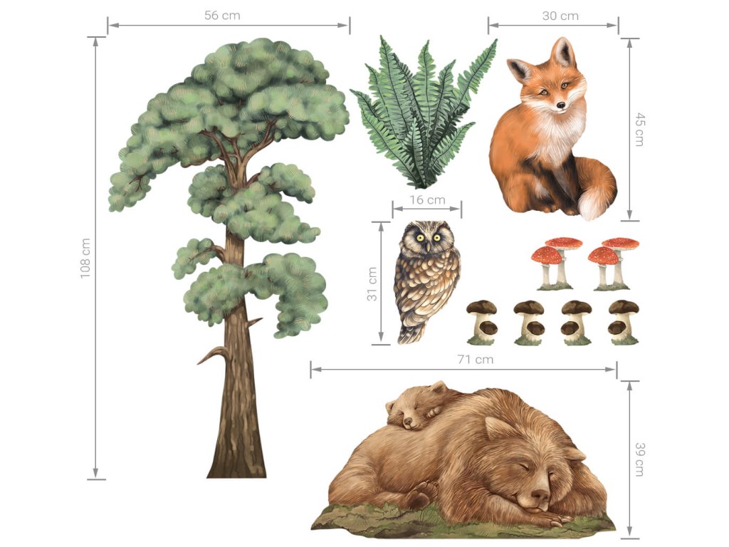 Samolepky roztomilých lesních zvířátek a prvků přírody přenesou kus lesa do dětského pokoje. Vyzdobte nálepkami stěny pokoje nebo jakýkoliv hladký povrh, jako skříně, zrcadla, poličky. Samolepka na stěnu je vyrobena v nejvyšší kvalitě. Nálepka je opatřena speciálním matným laminátem, který ji chrání před poškrábáním při každodenním používání, a také usnadňuje lepení – film je tlustší a snadněji se přenáší na stěnu.