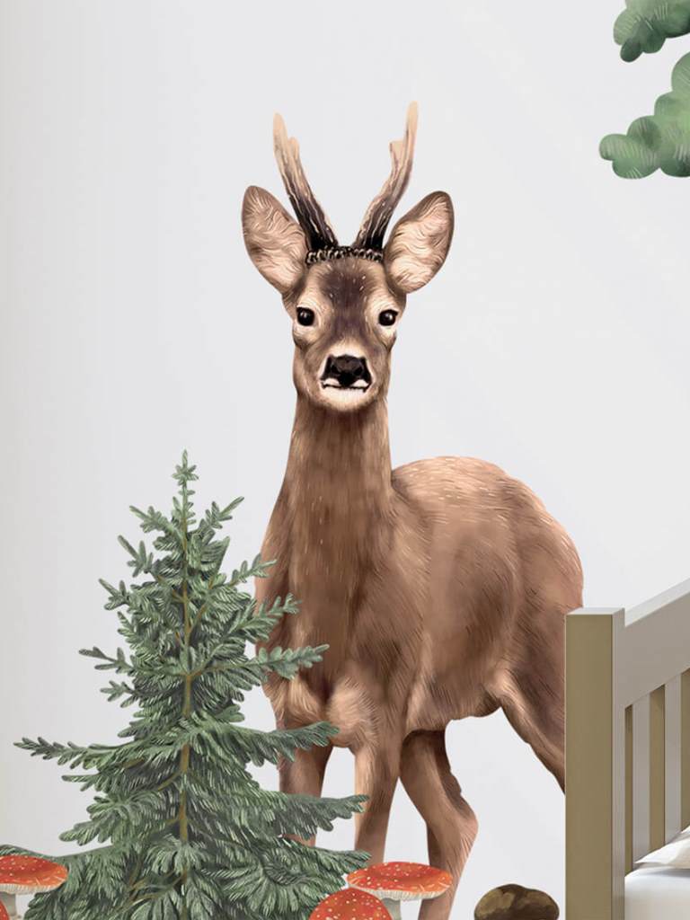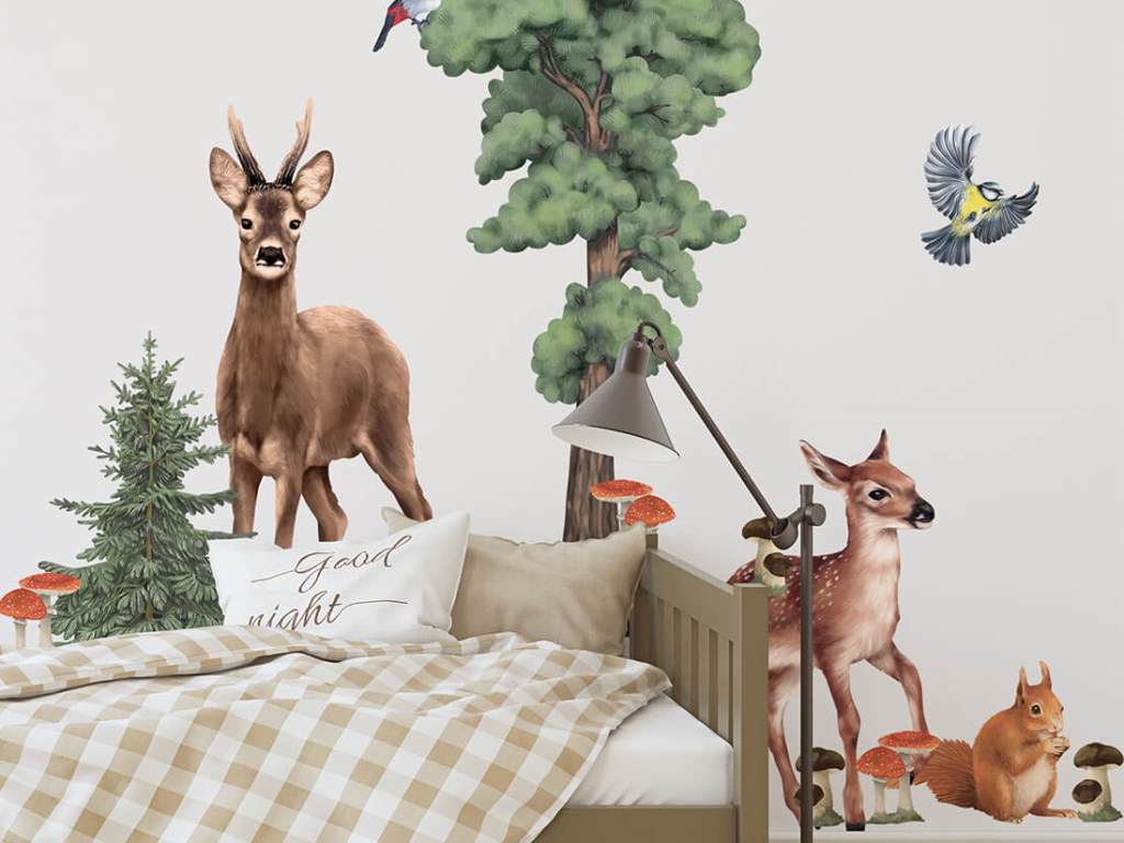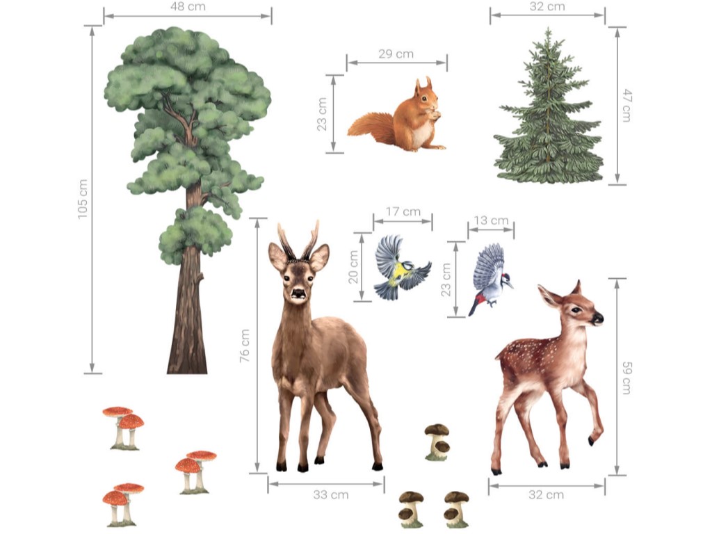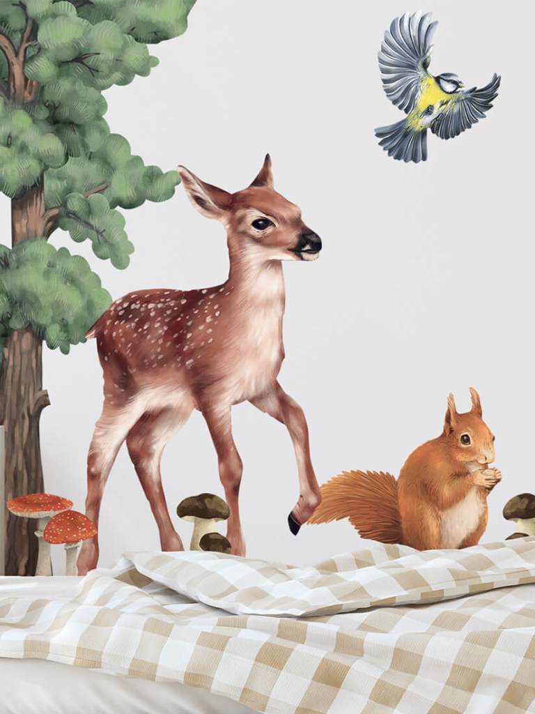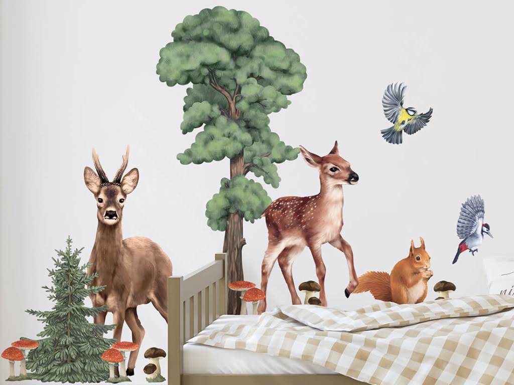 Samolepky na zeď lesní zvířátka jsou to správnou dekorací do dětského pokoje pro všechny milovníky přírody. Roztomilá zvířátka zpříjemní vašim potomkům okamžiky při hře i odpočinku. Samolepku v příjemných, přirozených barvách, můžete umístit na jakýkoli hladký povrch, což vám umožní zdobit nejen stěny, ale i nábytek a okna a vytvořit tím unikátní uspořádání. Nálepka lesní zvířátka je vyrobena v nejvyšší kvalitě. Nálepka na zeď je opatřena speciálním matným laminátem, který ji chrání před poškrábáním při každodenním používání, a také usnadňuje lepení – film je tlustší a snadněji se přenáší na stěnu.